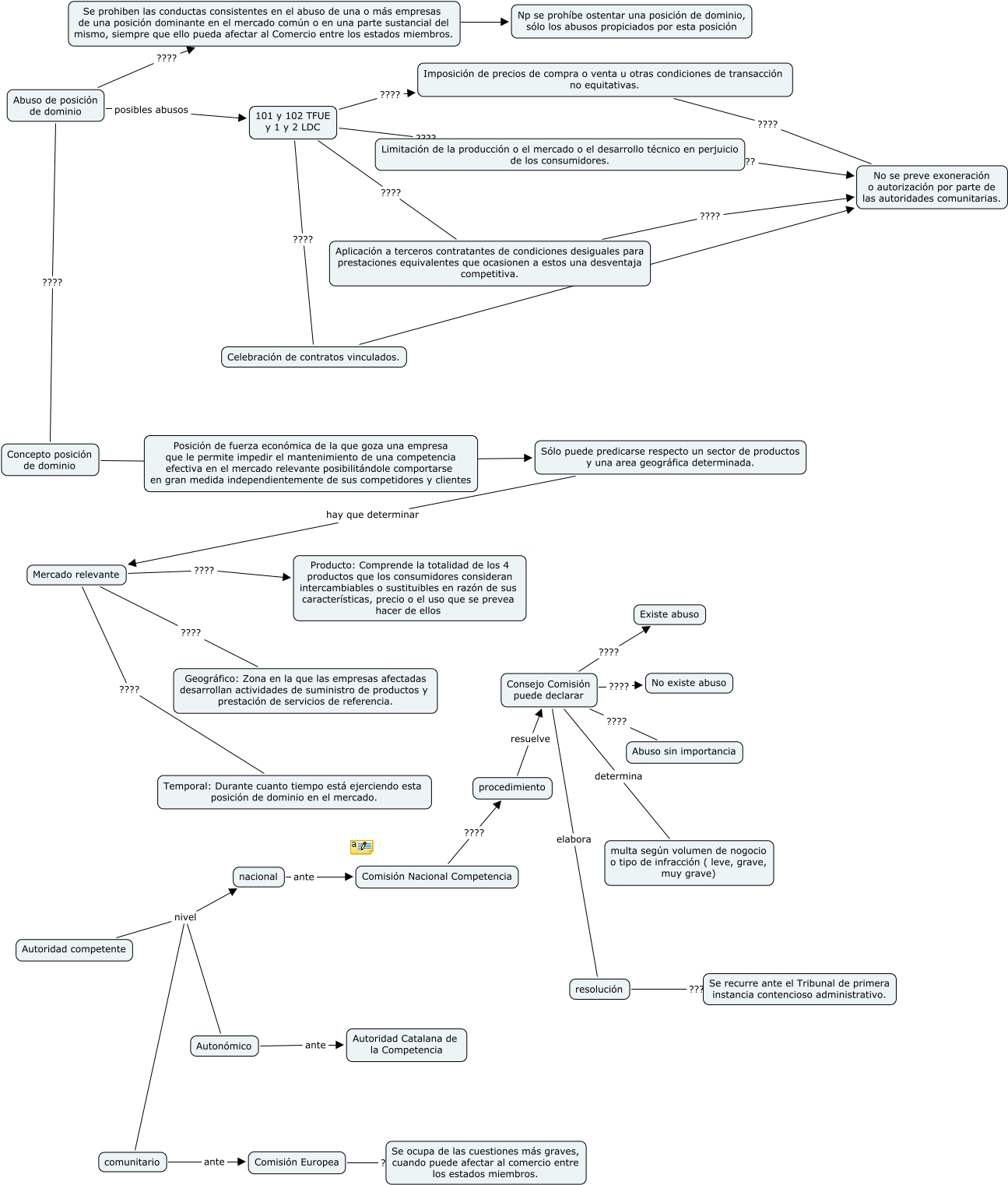 Este Cmap, tiene información relacionada con: Abuso de posición dominante, Sólo puede predicarse respecto un sector de productos y una area geográfica determinada. hay que determinar Mercado relevante, 101 y 102 TFUE y 1 y 2 LDC ???? Limitación de la producción o el mercado o el desarrollo técnico en perjuicio de los consumidores., Se prohiben las conductas consistentes en el abuso de una o más empresas de una posición dominante en el mercado común o en una parte sustancial del mismo, siempre que ello pueda afectar al Comercio entre los estados miembros. ???? Np se prohíbe ostentar una posición de dominio, sólo los abusos propiciados por esta posición, Autonómico ante Autoridad Catalana de la Competencia, Abuso de posición de dominio ???? Concepto posición de dominio, resolución ???? Se recurre ante el Tribunal de primera instancia contencioso administrativo., Autoridad competente nivel comunitario, Consejo Comisión puede declarar ???? Existe abuso, procedimiento resuelve Consejo Comisión puede declarar, Limitación de la producción o el mercado o el desarrollo técnico en perjuicio de los consumidores. ???? No se preve exoneración o autorización por parte de las autoridades comunitarias., nacional ante Comisión Nacional Competencia, Mercado relevante ???? Geográfico: Zona en la que las empresas afectadas desarrollan actividades de suministro de productos y prestación de servicios de referencia., Aplicación a terceros contratantes de condiciones desiguales para prestaciones equivalentes que ocasionen a estos una desventaja competitiva. ???? No se preve exoneración o autorización por parte de las autoridades comunitarias., Imposición de precios de compra o venta u otras condiciones de transacción no equitativas. ???? No se preve exoneración o autorización por parte de las autoridades comunitarias., Posición de fuerza económica de la que goza una empresa que le permite impedir el mantenimiento de una competencia efectiva en el mercado relevante posibilitándole comportarse en gran medida independientemente de sus competidores y clientes ???? Sólo puede predicarse respecto un sector de productos y una area geográfica determinada., Abuso de posición de dominio posibles abusos 101 y 102 TFUE y 1 y 2 LDC, Abuso de posición de dominio ???? Se prohiben las conductas consistentes en el abuso de una o más empresas de una posición dominante en el mercado común o en una parte sustancial del mismo, siempre que ello pueda afectar al Comercio entre los estados miembros., 101 y 102 TFUE y 1 y 2 LDC ???? Celebración de contratos vinculados., Consejo Comisión puede declarar determina multa según volumen de nogocio o tipo de infracción ( leve, grave, muy grave), Mercado relevante ???? Temporal: Durante cuanto tiempo está ejerciendo esta posición de dominio en el mercado.
