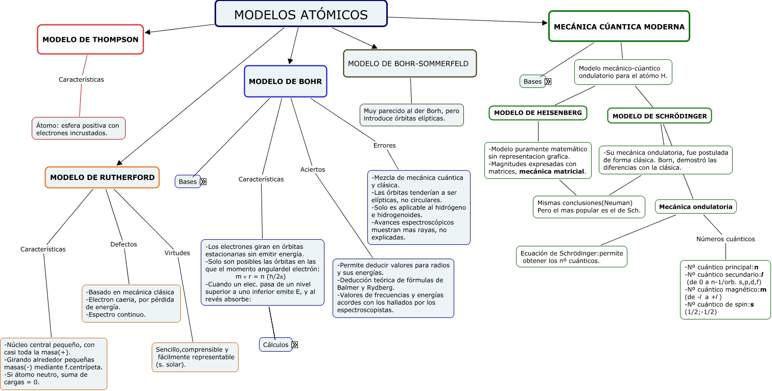 Este Cmap, tiene información relacionada con: Modelos atómicos, Jaime, Es imposible medir simultáneamente y con precisión absoluta, el valor de dos variables conjugadas. Posición y cantidad de movimiento <math xmlns="http://www.w3.org/1998/Math/MathML"> <mrow> <mtext> Δx Δ </mtext> <mmultiscripts> <mtext> p </mtext> <mtext> x </mtext> <none/> </mmultiscripts> <mtext> ≥ </mtext> <mfrac> <mtext> h </mtext> <mtext> 4π </mtext> </mfrac> </mrow> </math>, MODELO DE THOMPSON Características Átomo: esfera positiva con electrones incrustados., Dualidad onda-corpúsculo de la luz. Efecto fotoeléctrico: célula fotoeléctrica que por acción de la luz, desprende electrones del cátodo recogidos por el ánodo.La E de los e. depende de la ν y λ de la luz., MODELO DE SCHRÖDINGER Mecánica ondulatoria, MODELO DE BOHR Basado en MODELO DE RUTHERFORD, MODELO DE RUTHERFORD Virtudes Sencillo,comprensible y fácilmente representable (s. solar)., -Su mecánica ondulatoria, fue postulada de forma clásica. Born, demostró las diferencias con la clásica. Mismas conclusiones(Neuman) Pero el mas popular es el de Sch., Modelo mecánico-cúantico ondulatorio para el atómo H. MODELO DE SCHRÖDINGER, MODELOS ATÓMICOS MECÁNICA CÚANTICA MODERNA, Mecánica ondulatoria Ecuación de Schrödinger:permite obtener los nº cuánticos., MODELOS ATÓMICOS MODELO DE RUTHERFORD, Espectros atómicos Relación de Rydberg <math xmlns="http://www.w3.org/1998/Math/MathML"> <mrow> <mfrac> <mtext> 1 </mtext> <mtext> λ </mtext> </mfrac> <mtext> =R </mtext> <mfenced open="[" close="]"> <mfrac> <mtext> 1 </mtext> <mmultiscripts> <mtext> n </mtext> <none/> <mtext> 2 </mtext> </mmultiscripts> </mfrac> <mtext> - </mtext> <mfrac> <mtext> 1 </mtext> <mmultiscripts> <mtext> m </mtext> <none/> <mtext> 2 </mtext> </mmultiscripts> </mfrac> </mfenced> </mrow> </math>, Ondas elctromagnéticas <math xmlns="http://www.w3.org/1998/Math/MathML"> <mrow> <mtext> c=λν= </mtext> <mfrac> <mtext> 1 </mtext> <munderover> <mtext> ν </mtext> <none/> <mtext> - </mtext> </munderover> </mfrac> <mtext> ν= </mtext> <mfrac> <mtext> ν </mtext> <mtext> T </mtext> </mfrac> </mrow> </math>, Dualidad onda-corpúsculo de la luz. Efecto Compton: algunos rayos X, al dispersarse en la materia perdian energía y aumentaba λ., <math xmlns="http://www.w3.org/1998/Math/MathML"> <mrow> <mtext> -Los electrones giran en órbitas