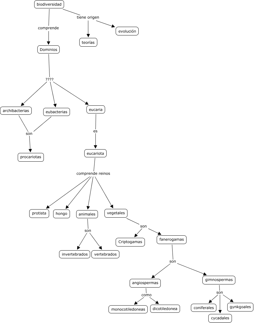 Este Cmap, tiene información relacionada con: biodiversidad, gimnospermas son gynkgoales, fanerogamas son angiospermas, eubacterias son procariotas, animales son vertebrados, gimnospermas son coniferales, Dominios ???? archibacterias, archibacterias son procariotas, angiospermas como monocotiledoneas, biodiversidad tiene origen teorías, vegetales son Criptogamas, biodiversidad comprende Dominios, eucariota comprende reinos protista, eucariota comprende reinos animales, angiospermas como dicotiledonea, eucariota comprende reinos vegetales, eucaria es eucariota, Dominios ???? eucaria, vegetales son fanerogamas, fanerogamas son gimnospermas, gimnospermas son cycadales