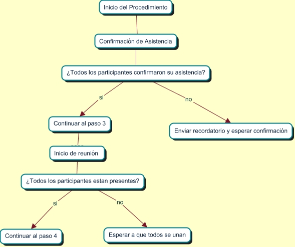 Este Cmap, tiene información relacionada con: diagrama de flijo, ¿Todos los participantes estan presentes? si Continuar al paso 4, Continuar al paso 3 ???? Inicio de reunión, Inicio del Procedimiento 2 Confirmación de Asistencia, Inicio de reunión ???? ¿Todos los participantes estan presentes?, Confirmación de Asistencia ???? ¿Todos los participantes confirmaron su asistencia?, ¿Todos los participantes confirmaron su asistencia? no Enviar recordatorio y esperar confirmación, ¿Todos los participantes confirmaron su asistencia? si Continuar al paso 3, ¿Todos los participantes estan presentes? no Esperar a que todos se unan