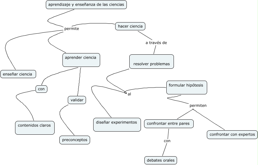 Este Cmap, tiene información relacionada con: taller, aprendizaje y enseñanza de las ciencias permite hacer ciencia, con aprender ciencia, resolver problemas al formular hipótesis, confrontar entre pares con debates orales, hacer ciencia a través de resolver problemas, validar preconceptos, formular hipótesis permiten confrontar entre pares, aprendizaje y enseñanza de las ciencias permite enseñar ciencia, contenidos claros con, validar aprender ciencia, formular hipótesis permiten confrontar con expertos, resolver problemas al diseñar experimentos, aprendizaje y enseñanza de las ciencias permite aprender ciencia