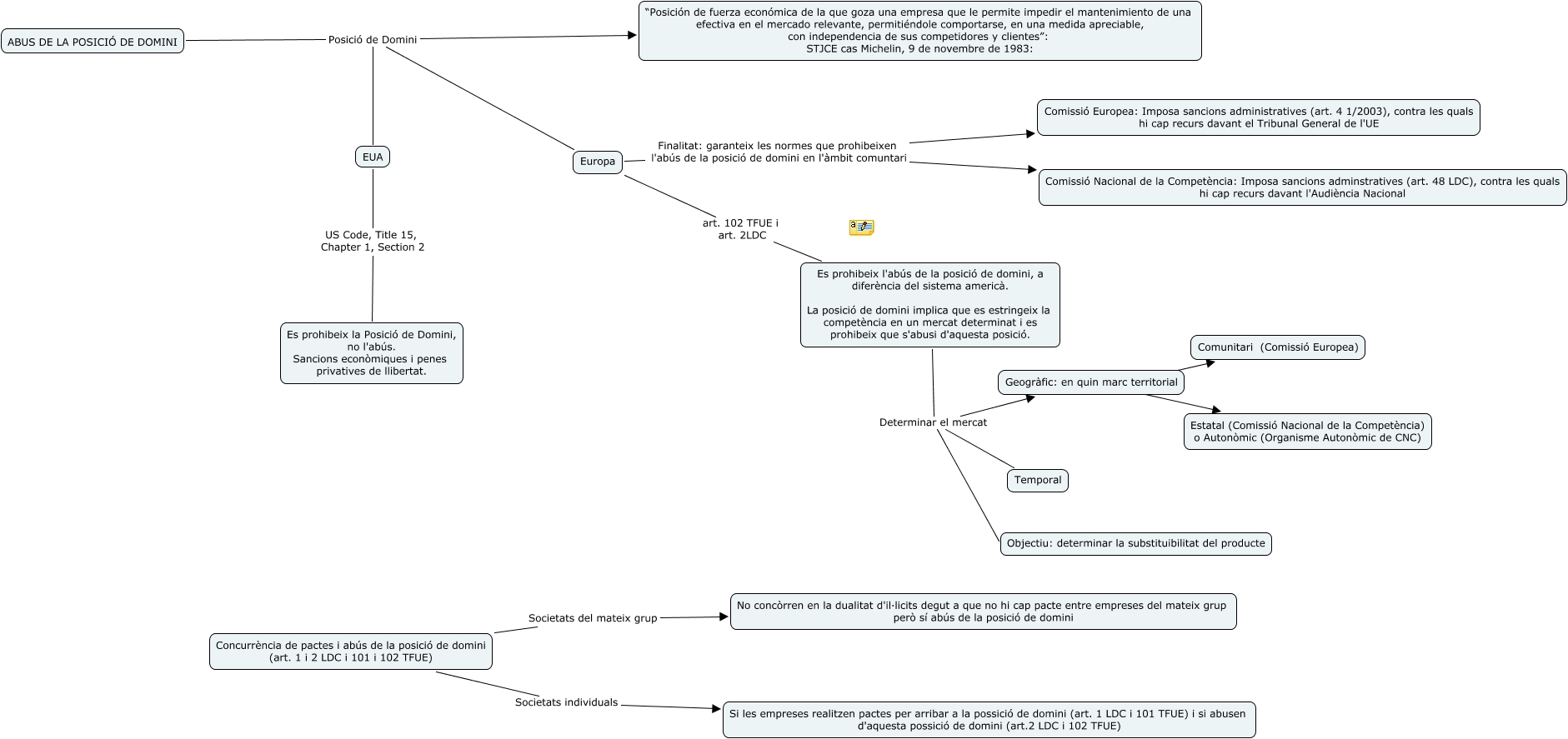 Este Cmap, tiene información relacionada con: Escenari 3. Abús de la posició de domini, Europa art. 102 TFUE i art. 2LDC Es prohibeix l'abús de la posició de domini, a diferència del sistema americà. La posició de domini implica que es estringeix la competència en un mercat determinat i es prohibeix que s'abusi d'aquesta posició., Europa Finalitat: garanteix les normes que prohibeixen l'abús de la posició de domini en l'àmbit comuntari Comissió Nacional de la Competència: Imposa sancions adminstratives (art. 48 LDC), contra les quals hi cap recurs davant l'Audiència Nacional, EUA US Code, Title 15, Chapter 1, Section 2 Es prohibeix la Posició de Domini, no l'abús. Sancions econòmiques i penes privatives de llibertat., Geogràfic: en quin marc territorial ???? Comunitari (Comissió Europea), Concurrència de pactes i abús de la posició de domini (art. 1 i 2 LDC i 101 i 102 TFUE) Societats individuals Si les empreses realitzen pactes per arribar a la possició de domini (art. 1 LDC i 101 TFUE) i si abusen d'aquesta possició de domini (art.2 LDC i 102 TFUE), Geogràfic: en quin marc territorial ???? Estatal (Comissió Nacional de la Competència) o Autonòmic (Organisme Autonòmic de CNC), ABUS DE LA POSICIÓ DE DOMINI Posició de Domini EUA, ABUS DE LA POSICIÓ DE DOMINI Posició de Domini “Posición de fuerza económica de la que goza una empresa que le permite impedir el mantenimiento de una efectiva en el mercado relevante, permitiéndole comportarse, en una medida apreciable, con independencia de sus competidores y clientes”: STJCE cas Michelin, 9 de novembre de 1983:, ABUS DE LA POSICIÓ DE DOMINI Posició de Domini Europa, Europa Finalitat: garanteix les normes que prohibeixen l'abús de la posició de domini en l'àmbit comuntari Comissió Europea: Imposa sancions administratives (art. 4 1/2003), contra les quals hi cap recurs davant el Tribunal General de l'UE, Es prohibeix l'abús de la posició de domini, a diferència del sistema americà. La posició de domini implica que es estringeix la competència en un mercat determinat i es prohibeix que s'abusi d'aquesta posició. Determinar el mercat Objectiu: determinar la substituibilitat del producte, Es prohibeix l'abús de la posició de domini, a diferència del sistema americà. La posició de domini implica que es estringeix la competència en un mercat determinat i es prohibeix que s'abusi d'aquesta posició. Determinar el mercat Geogràfic: en quin marc territorial, Concurrència de pactes i abús de la posició de domini (art. 1 i 2 LDC i 101 i 102 TFUE) Societats del mateix grup No concòrren en la dualitat d'il·licits degut a que no hi cap pacte entre empreses del mateix grup però sí abús de la posició de domini, Es prohibeix l'abús de la posició de domini, a diferència del sistema americà. La posició de domini implica que es estringeix la competència en un mercat determinat i es prohibeix que s'abusi d'aquesta posició. Determinar el mercat Temporal