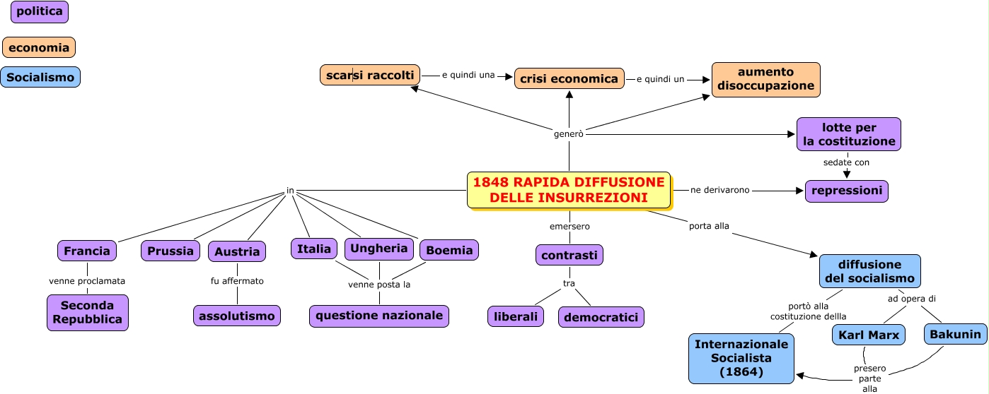 Questa Mappa Concettuale ha informazioni correlate a: 1848, 1848 RAPIDA DIFFUSIONE DELLE INSURREZIONI in Francia, contrasti tra liberali, 1848 RAPIDA DIFFUSIONE DELLE INSURREZIONI in Prussia, Italia venne posta la questione nazionale, 1848 RAPIDA DIFFUSIONE DELLE INSURREZIONI porta alla diffusione del socialismo, diffusione del socialismo ad opera di Karl Marx, 1848 RAPIDA DIFFUSIONE DELLE INSURREZIONI emersero contrasti, 1848 RAPIDA DIFFUSIONE DELLE INSURREZIONI in Austria, Ungheria venne posta la questione nazionale, Bakunin presero parte alla Internazionale Socialista (1864), 1848 RAPIDA DIFFUSIONE DELLE INSURREZIONI ne derivarono repressioni, Karl Marx presero parte alla Internazionale Socialista (1864), Boemia venne posta la questione nazionale, 1848 RAPIDA DIFFUSIONE DELLE INSURREZIONI in Boemia, Austria fu affermato assolutismo, 1848 RAPIDA DIFFUSIONE DELLE INSURREZIONI generò crisi economica, contrasti tra democratici, 1848 RAPIDA DIFFUSIONE DELLE INSURREZIONI generò lotte per la costituzione, diffusione del socialismo ad opera di Bakunin, scarsi raccolti e quindi una crisi economica