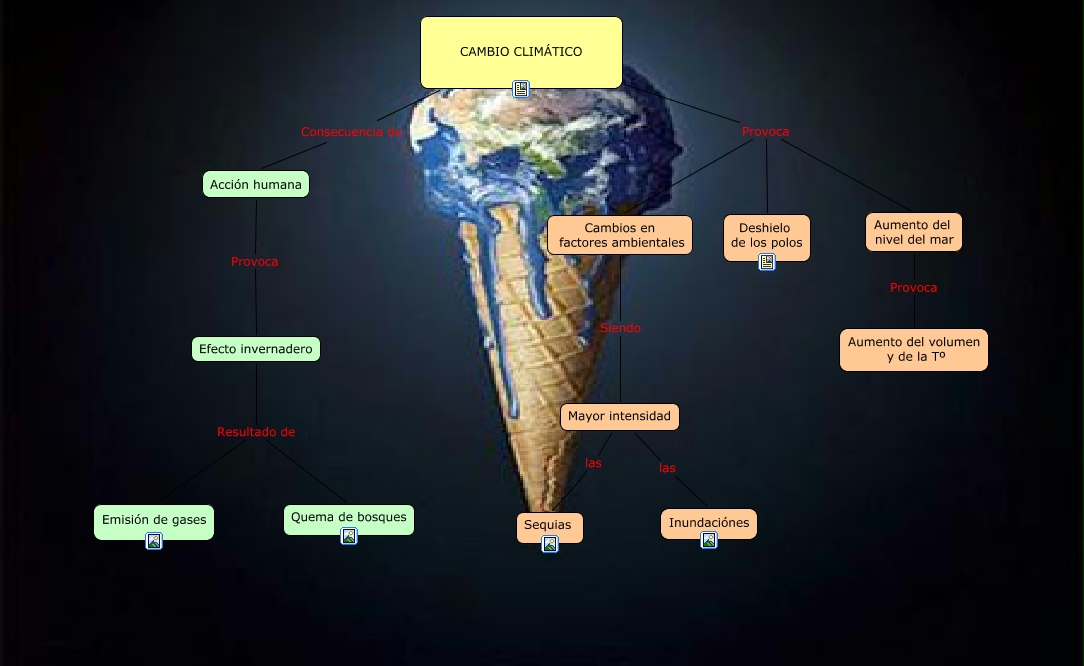 Este Cmap, tiene información relacionada con: Cambio Climático, Acción humana Provoca Efecto invernadero, CAMBIO CLIMÁTICO Provoca Cambios en factores ambientales, CAMBIO CLIMÁTICO Provoca Deshielo de los polos, Aumento del nivel del mar Provoca Aumento del volumen y de la Tº, Cambios en factores ambientales Siendo Mayor intensidad, Mayor intensidad las Inundaciónes, Efecto invernadero Resultado de Quema de bosques, CAMBIO CLIMÁTICO Consecuencia de Acción humana, Efecto invernadero Resultado de Emisión de gases, CAMBIO CLIMÁTICO Provoca Aumento del nivel del mar, Mayor intensidad las Sequias