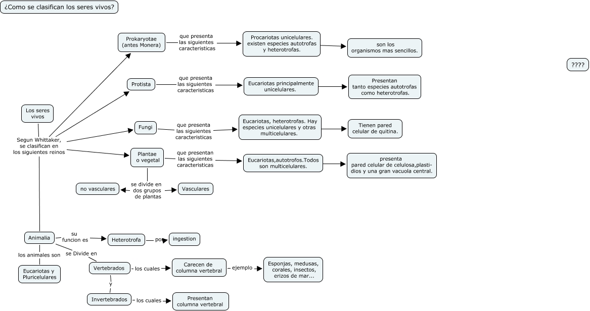 Este Cmap, tiene información relacionada con: Clasificacion De Los Seres Vivos, Vertebrados los cuales Carecen de columna vertebral, Los seres vivos Segun Whittaker, se clasifican en los siguientes reinos Fungi, Carecen de columna vertebral ejemplo Esponjas, medusas, corales, insectos, erizos de mar..., Plantae o vegetal que presentan las siguientes caracteristicas Eucariotas,autotrofos.Todos son multicelulares., Invertebrados los cuales Presentan columna vertebral, Animalia se Divide en Vertebrados, Eucariotas, heterotrofas. Hay especies unicelulares y otras multicelulares. ???? Tienen pared celular de quitina., Plantae o vegetal se divide en dos grupos de plantas Vasculares, Vertebrados y Invertebrados, Los seres vivos Segun Whittaker, se clasifican en los siguientes reinos Protista, Los seres vivos Segun Whittaker, se clasifican en los siguientes reinos Prokaryotae (antes Monera), Animalia su funcion es Heterotrofa, Animalia los animales son Eucariotas y Pluricelulares, Procariotas unicelulares. existen especies autotrofas y heterotrofas. ???? son los organismos mas sencillos., Los seres vivos Segun Whittaker, se clasifican en los siguientes reinos Plantae o vegetal, Eucariotas principalmente unicelulares. ???? Presentan tanto especies autotrofas como heterotrofas., Los seres vivos Segun Whittaker, se clasifican en los siguientes reinos Animalia, Prokaryotae (antes Monera) que presenta las siguientes caracteristicas Procariotas unicelulares. existen especies autotrofas y heterotrofas., Heterotrofa por ingestion, Eucariotas,autotrofos.Todos son multicelulares. ???? presenta pared celular de celulosa,plasti- dios y una gran vacuola central.