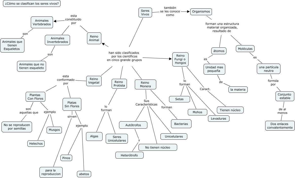 Este Cmap, tiene información relacionada con: Seres Vivos NNCG, Seres Vivos han sido clasificados por los científicos en cinco grande grupos Reino Protista, Platas Sin Flores ejemplo Pinos, Seres Vivos han sido clasificados por los científicos en cinco grande grupos Reino Monera, átomos es Unidad mas pequeña, Reino Monera Sus Características No tienen nùcleo, Platas Sin Flores sirven para la reproduccion, Reino Monera Sus Características Unicelulares, Platas Sin Flores ejemplo abetos, Reino Monera Sus Características Autótrofos, Plantas Con Flores son aquellas que No se reproducen por semillas, Reino Fungi o Hongos lo forman Setas, Autótrofos y Heterótrofo, Seres Vivos han sido clasificados por los científicos en cinco grande grupos Reino Vegetal, Reino Animal esta constituido por Animales Vertebrados, una partícula neutra formda por Conjunto estable, Reino Fungi o Hongos Caract. Tienen núcleo, Reino Vegetal esta conformado por Platas Sin Flores, Reino Protista lo forman Algas, Reino Fungi o Hongos lo forman Mohos, Seres Vivos han sido clasificados por los científicos en cinco grande grupos Reino Fungi o Hongos