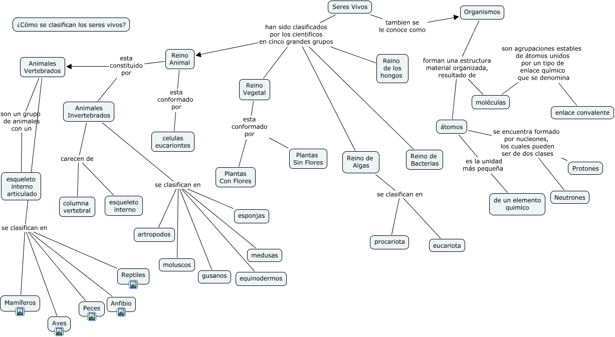 Este Cmap, tiene información relacionada con: seres vivos, Reino Animal esta constituido por Animales Vertebrados, Seres Vivos han sido clasificados por los cientificos en cinco grandes grupos Reino de Bacterias, Organismos forman una estructura material organizada, resultado de átomos, Seres Vivos han sido clasificados por los cientificos en cinco grandes grupos Reino Vegetal, Reino Vegetal esta conformado por Plantas Con Flores, átomos se encuentra formado por nucleones, los cuales pueden ser de dos clases Neutrones, átomos se encuentra formado por nucleones, los cuales pueden ser de dos clases Protones, Animales Vertebrados se clasifican en Reptiles, Animales Invertebrados se clasifican en equinodermos, Animales Vertebrados se clasifican en Aves, átomos es la unidad más pequeña de un elemento quimico, Animales Invertebrados se clasifican en artropodos, Seres Vivos han sido clasificados por los cientificos en cinco grandes grupos Reino de los hongos, Reino Vegetal esta conformado por Plantas Sin Flores, Reino Animal esta constituido por Animales Invertebrados, moléculas son agrupaciones estables de átomos unidos por un tipo de enlace químico que se denomina enlace convalente, Animales Vertebrados se clasifican en Peces, Seres Vivos tambien se le conoce como Organismos, Reino de Algas se clasifican en procariota, Animales Invertebrados carecen de columna vertebral