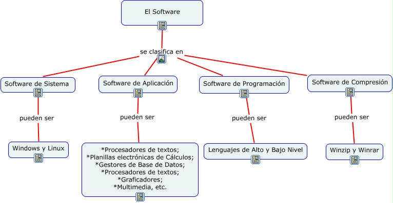 Este Cmap, tiene información relacionada con: Clasificación del Software, Software de Sistema pueden ser Windows y Linux, El Software se clasifica en Software de Aplicación, El Software se clasifica en Software de Programación, El Software se clasifica en Software de Sistema, Software de Aplicación pueden ser *Procesadores de textos; *Planillas electrónicas de Cálculos; *Gestores de Base de Datos; *Procesadores de textos; *Graficadores; *Multimedia, etc., Software de Programación pueden ser Lenguajes de Alto y Bajo Nivel, Software de Compresión pueden ser Winzip y Winrar, El Software se clasifica en Software de Compresión