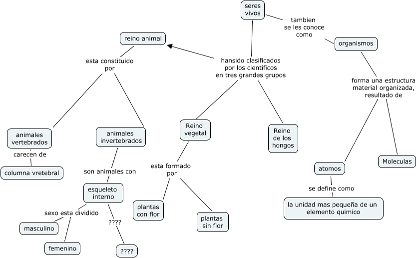 Este Cmap, tiene información relacionada con: los seres vivos, Reino vegetal esta formado por plantas sin flor, reino animal esta constituido por animales vertebrados, esqueleto interno sexo esta dividido femenino, animales vertebrados carecen de columna vretebral, Reino vegetal esta formado por plantas con flor, seres vivos hansido clasificados por los cientificos en tres grandes grupos Reino vegetal, atomos se define como la unidad mas pequeña de un elemento quimico, esqueleto interno sexo esta dividido masculino, organismos forma una estructura material organizada, resultado de Moleculas, esqueleto interno ???? ????, seres vivos hansido clasificados por los cientificos en tres grandes grupos reino animal, seres vivos tambien se les conoce como organismos, organismos forma una estructura material organizada, resultado de atomos, reino animal esta constituido por animales invertebrados, seres vivos hansido clasificados por los cientificos en tres grandes grupos Reino de los hongos, animales invertebrados son animales con esqueleto interno