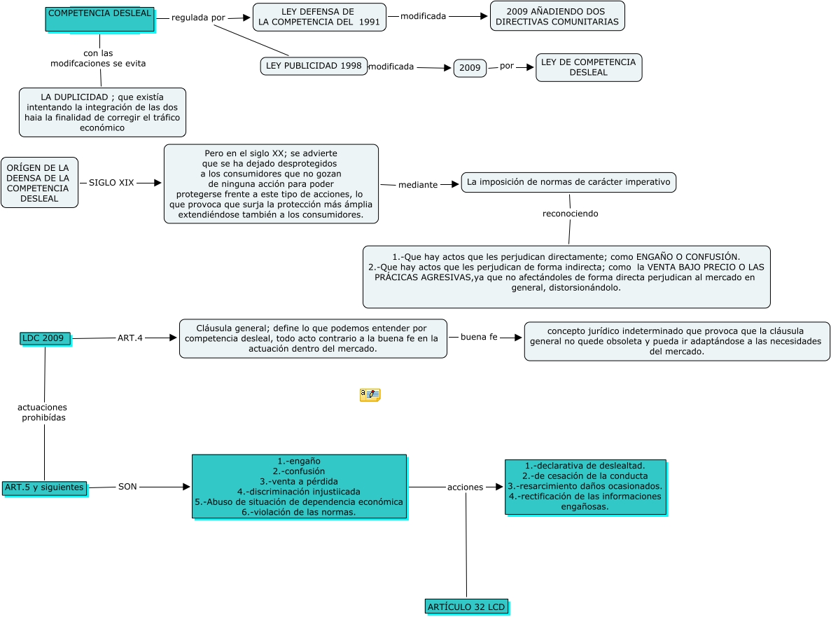 Este Cmap, tiene información relacionada con: CASO PRÁCTICO TOTUNCLAM, La imposición de normas de carácter imperativo reconociendo 1.-Que hay actos que les perjudican directamente; como ENGAÑO O CONFUSIÓN. 2.-Que hay actos que les perjudican de forma indirecta; como la VENTA BAJO PRECIO O LAS PRÁCICAS AGRESIVAS,ya que no afectándoles de forma directa perjudican al mercado en general, distorsionándolo., COMPETENCIA DESLEAL con las modifcaciones se evita LA DUPLICIDAD ; que existía intentando la integración de las dos haia la finalidad de corregir el tráfico económico, 1.-engaño 2.-confusión 3.-venta a pérdida 4.-discriminación injustiicada 5.-Abuso de situación de dependencia económica 6.-violación de las normas. acciones 1.-declarativa de deslealtad. 2.-de cesación de la conducta 3.-resarcimiento daños ocasionados. 4.-rectificación de las informaciones engañosas., LDC 2009 actuaciones prohibídas ART.5 y siguientes, LEY PUBLICIDAD 1998 modificada 2009, ORÍGEN DE LA DEENSA DE LA COMPETENCIA DESLEAL SIGLO XIX Pero en el siglo XX; se advierte que se ha dejado desprotegidos a los consumidores que no gozan de ninguna acción para poder protegerse frente a este tipo de acciones, lo que provoca que surja la protección más ámplia extendiéndose también a los consumidores., 1.-engaño 2.-confusión 3.-venta a pérdida 4.-discriminación injustiicada 5.-Abuso de situación de dependencia económica 6.-violación de las normas. acciones ARTÍCULO 32 LCD, LDC 2009 ART.4 Cláusula general; define lo que podemos entender por competencia desleal, todo acto contrario a la buena fe en la actuación dentro del mercado., Cláusula general; define lo que podemos entender por competencia desleal, todo acto contrario a la buena fe en la actuación dentro del mercado. buena fe concepto jurídico indeterminado que provoca que la cláusula general no quede obsoleta y pueda ir adaptándose a las necesidades del mercado., 2009 por LEY DE COMPETENCIA DESLEAL, ART.5 y siguientes SON 1.-engaño 2.-confusión 3.-venta a pérdida 4.-discriminación injustiicada 5.-Abuso de situación de dependencia económica 6.-violación de las normas., LEY DEFENSA DE LA COMPETENCIA DEL 1991 modificada 2009 AÑADIENDO DOS DIRECTIVAS COMUNITARIAS, Pero en el siglo XX; se advierte que se ha dejado desprotegidos a los consumidores que no gozan de ninguna acción para poder protegerse frente a este tipo de acciones, lo que provoca que surja la protección más ámplia extendiéndose también a los consumidores. mediante La imposición de normas de carácter imperativo, COMPETENCIA DESLEAL regulada por LEY DEFENSA DE LA COMPETENCIA DEL 1991, COMPETENCIA DESLEAL regulada por LEY PUBLICIDAD 1998