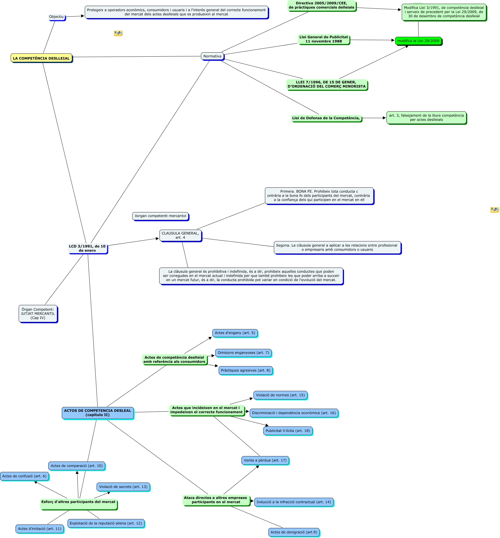 Este Cmap, tiene información relacionada con: Escenari 4. Competència deslleial, CLAUSULA GENERAL, art. 4 ???? Segona. La clàusula general a aplicar a les relacions entre profesional o empresaris amb consumidors o usuaris, ACTOS DE COMPETENCIA DESLEAL (capítulo II) Actes que incideixen en el mercat i impedeixen el correcte funcionament Publicitat il·lícita (art. 18), Normativa LLEI 7/1996, DE 15 DE GENER, D'ORDENACIÓ DEL COMERÇ MINORISTA modifica la Llei 29/2009, ACTOS DE COMPETENCIA DESLEAL (capítulo II) Actes que incideixen en el mercat i impedeixen el correcte funcionament Discriminació i dependència econòmica (art. 16), CLAUSULA GENERAL, art. 4 ???? Primera. BONA FE. Prohibeix tota conducta c ontrària a la bona fe dels participants del mercat, contrària a la confiança dels qui participen en el mercat en ell, CLAUSULA GENERAL, art. 4 ???? La clàusula general és prohibitiva i indefinida, és a dir, prohibeix aquelles conductes que poden ser conegudes en el mercat actual i indefinida per que també prohibeix les que poder arriba a succeir en un mercat futur, és a dir, la conducta prohibida pot variar en condició de l'evolució del mercat., Normativa Llei de Defensa de la Competència, art. 3, falsejament de la lliure competència per actes deslleials, ACTOS DE COMPETENCIA DESLEAL (capítulo II) Actes que incideixen en el mercat i impedeixen el correcte funcionament Violació de normes (art. 15), ACTOS DE COMPETENCIA DESLEAL (capítulo II) Esforç d'altres participants del mercat Actes de confusió (art. 6), LA COMPETÈNCIA DESLLEIAL Objectiu Protegeix a operadors econòmics, consumidors i usuaris i a l'interès general del correcte funcionament del mercat dels actes deslleials que es produeixin al mercat, ACTOS DE COMPETENCIA DESLEAL (capítulo II) Actes de competència deslleial amb referència als consumidors Omisions enganyoses (art. 7), ACTOS DE COMPETENCIA DESLEAL (capítulo II) Atacs directes a altres empreses participants en el mercat Inducció a la infracció contractual (art. 14), ACTOS DE COMPETENCIA DESLEAL (capítulo II) Esforç d'altres participants del mercat Actes de comparació (art. 10), ACTOS DE COMPETENCIA DESLEAL (capítulo II) Actes de competència deslleial amb referència als consumidors Actes d'engany (art. 5), Normativa Directiva 2005/2009/CEE, de pràctiques comercials delleials Modifica Llei 3/1991, de competència deslleial i serveix de precedent per la Lei 29/2009, de 30 de desembre de competència deslleial, LA COMPETÈNCIA DESLLEIAL LCD 3/1991, de 10 de enero CLAUSULA GENERAL, art. 4, LA COMPETÈNCIA DESLLEIAL LCD 3/1991, de 10 de enero ACTOS DE COMPETENCIA DESLEAL (capítulo II), Normativa Llei General de Publicitat 11 novembre 1988 modifica la Llei 29/2009, modifica la Llei 29/2009 ???? Modifica Llei 3/1991, de competència deslleial i serveix de precedent per la Lei 29/2009, de 30 de desembre de competència deslleial, ACTOS DE COMPETENCIA DESLEAL (capítulo II) Atacs directes a altres empreses participants en el mercat Actes de denigració (art.9)