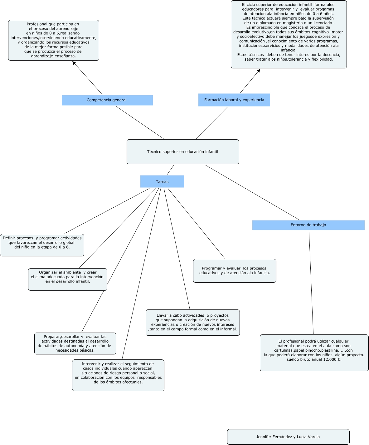 Este Cmap, tiene información relacionada con: 1, Técnico superior en educación infantil Tareas Definir procesos y programar actividades que favorezcan el desarrollo global del niño en la etapa de 0 a 6., Técnico superior en educación infantil Entorno de trabajo El profesional podrá utilizar cualquier material que estea en el aula como son cartulinas,papel pinocho,plastilina......con la que poderá elaborar con los niños algún proyecto. sueldo bruto anual 12.000 €., Técnico superior en educación infantil Tareas Programar y evaluar los procesos educativos y de atención ala infancia., Técnico superior en educación infantil Tareas Llevar a cabo actividades o proyectos que supongan la adquisición de nuevas experiencias o creación de nuevos intereses ,tanto en el campo formal como en el informal., Técnico superior en educación infantil Competencia general Profesional que participa en el proceso del aprendizaje en niños de 0 a 6,realizando intervenciones,interviniendo educativamente, y organizando los recursos educativos de la mejor forma posible para que se produzca el proceso de aprendizaje-enseñanza., Técnico superior en educación infantil Tareas Intervenir y realizar el seguimiento de casos individuales cuando aparezcan situaciones de riesgo personal o social, en colaboración con los equipos responsables de los ámbitos afectuales., Técnico superior en educación infantil Tareas Preparar,desarollar y evaluar las actividades destinadas al desarrollo de hábitos de autonomía y atención de necesidades básicas., Técnico superior en educación infantil Formación laboral y experiencia El ciclo superior de educación infantil forma alos educadores para intervenir y evaluar progamas de atencion ala infancia en niños de 0 a 6 años. Este técnico actuará siempre bajo la supervisión de un diplomado en magisterio o un licenciado . Es imprescindible que conozca el proceso de desarollo evolutivo,en todos sus ámbitos:cognitivo -motor y socioafectivo.debe manejar los juegosde expresión y comunicación ,el conocimiento de varios programas, instituciones,servicios y modalidades de atención ala infancia. Estos técnicos deben de tener interes por la docencia, saber tratar alos niños,tolerancia y flexibilidad., Técnico superior en educación infantil Tareas Organizar el ambiente y crear el clima adecuado para la intervención en el desarrollo infantil.