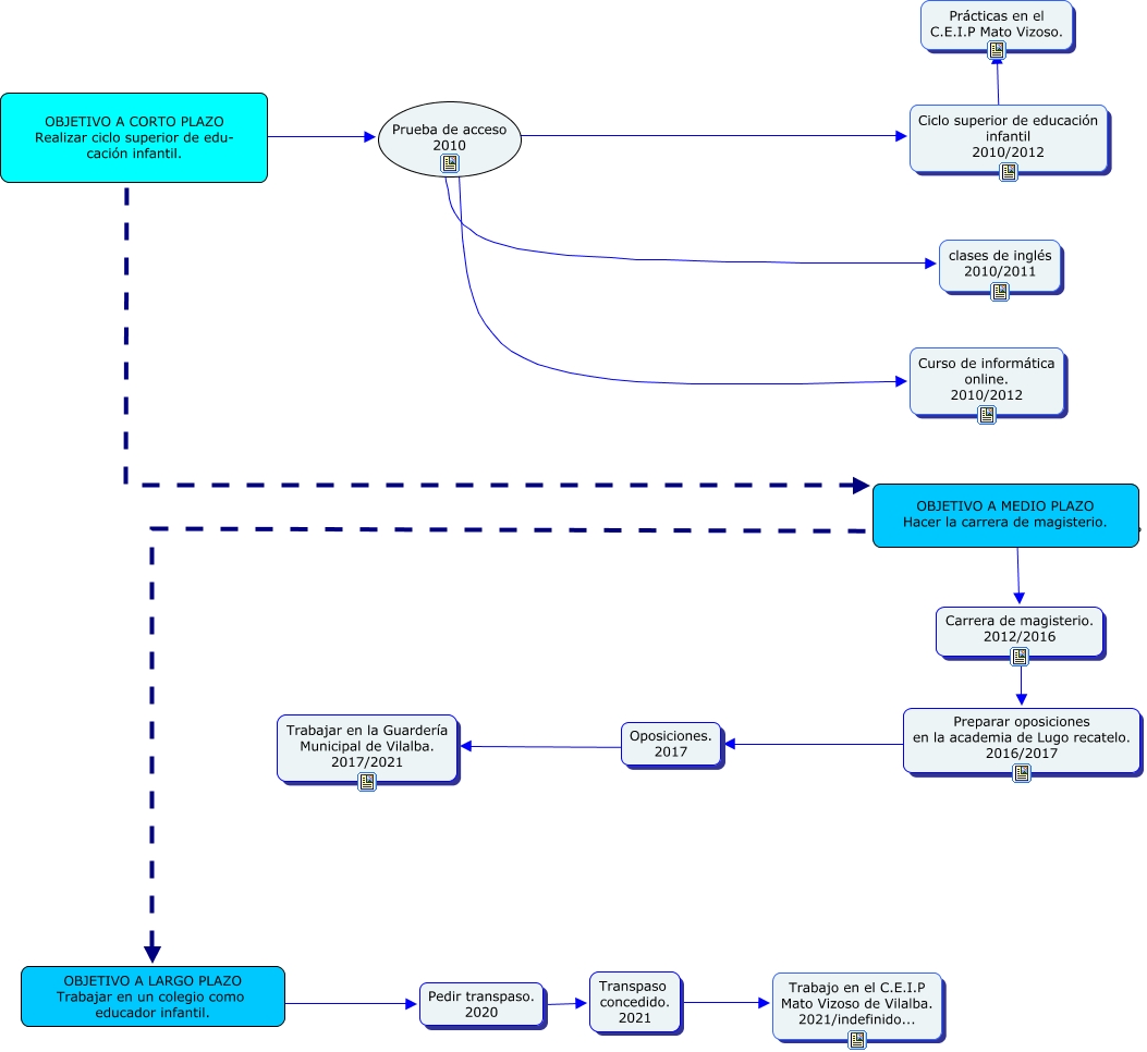 Este Cmap, tiene información relacionada con: itinerario propio, Pedir transpaso. 2020 Tra Transpaso concedido. 2021, Carrera de magisterio. 2012/2016 ???? Preparar oposiciones en la academia de Lugo recatelo. 2016/2017, OBJETIVO A MEDIO PLAZO Hacer la carrera de magisterio. ???? Carrera de magisterio. 2012/2016, Prueba de acceso 2010 ???? Curso de informática online. 2010/2012, OBJETIVO A CORTO PLAZO Realizar ciclo superior de edu- cación infantil. ???? Prueba de acceso 2010, Oposiciones. 2017 ???? Trabajar en la Guardería Municipal de Vilalba. 2017/2021, Preparar oposiciones en la academia de Lugo recatelo. 2016/2017 ???? Oposiciones. 2017, OBJETIVO A MEDIO PLAZO Hacer la carrera de magisterio. ???? OBJETIVO A LARGO PLAZO Trabajar en un colegio como educador infantil., OBJETIVO A CORTO PLAZO Realizar ciclo superior de edu- cación infantil. ???? OBJETIVO A MEDIO PLAZO Hacer la carrera de magisterio., Transpaso concedido. 2021 ???? Trabajo en el C.E.I.P Mato Vizoso de Vilalba. 2021/indefinido..., Prueba de acceso 2010 ???? Ciclo superior de educación infantil 2010/2012, Ciclo superior de educación infantil 2010/2012 ???? Prácticas en el C.E.I.P Mato Vizoso., Prueba de acceso 2010 ???? clases de inglés 2010/2011, OBJETIVO A LARGO PLAZO Trabajar en un colegio como educador infantil. ???? Pedir transpaso. 2020