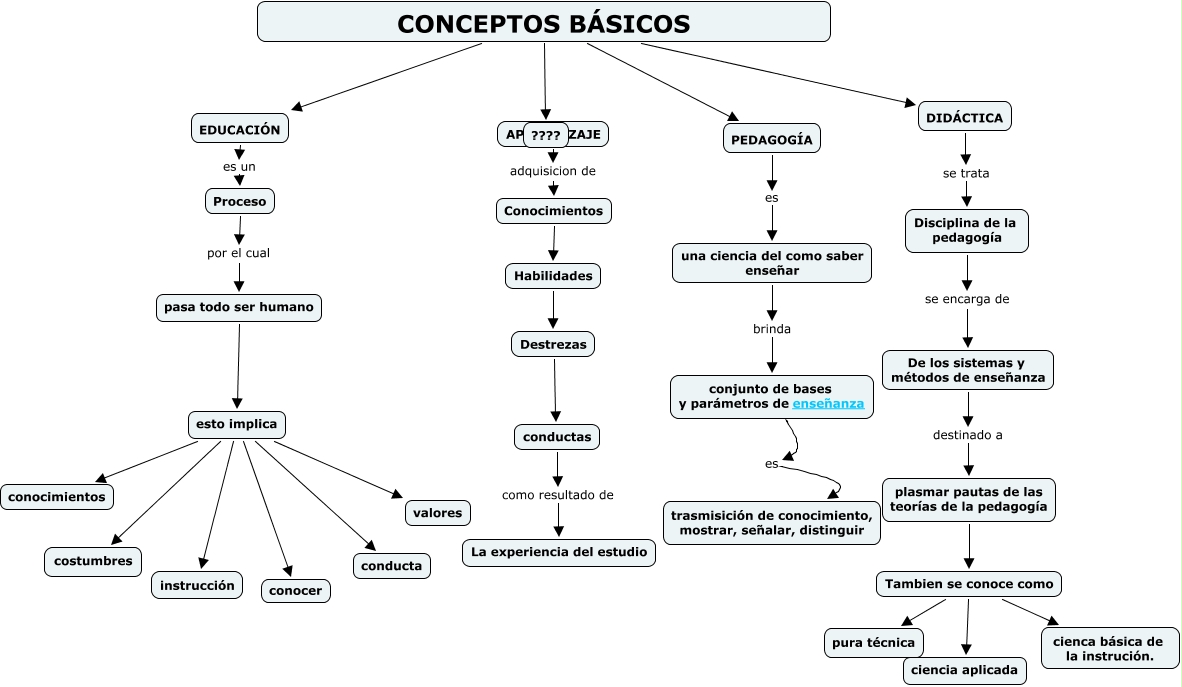 Este Cmap, tiene información relacionada con: mapa de conceptos básicos, Habilidades Destrezas, esto implica instrucción, Tambien se conoce como cienca básica de la instrución., PEDAGOGÍA es una ciencia del como saber enseñar, APRENDIZAJE adquisicion de Conocimientos, plasmar pautas de las teorías de la pedagogía Tambien se conoce como, De los sistemas y métodos de enseñanza destinado a plasmar pautas de las teorías de la pedagogía, esto implica conocer, CONCEPTOS BÁSICOS ????, Destrezas conductas, Tambien se conoce como pura técnica, una ciencia del como saber enseñar brinda conjunto de bases y parámetros de enseñanza, CONCEPTOS BÁSICOS EDUCACIÓN, esto implica conocimientos, pasa todo ser humano esto implica, EDUCACIÓN es un Proceso, CONCEPTOS BÁSICOS PEDAGOGÍA, CONCEPTOS BÁSICOS DIDÁCTICA, Conocimientos Habilidades, esto implica costumbres
