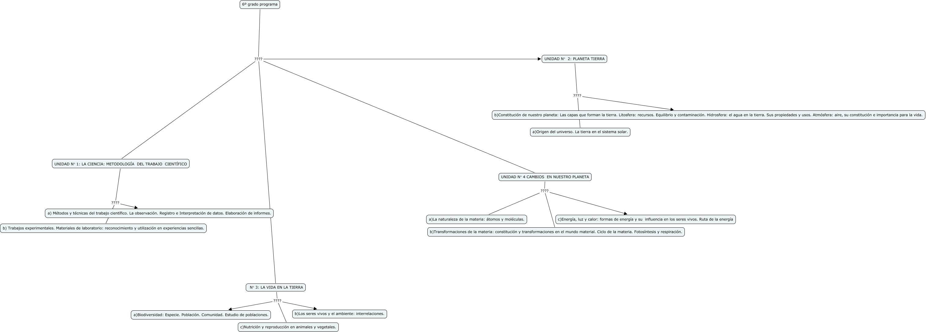 Este Cmap, tiene información relacionada con: programa 6 grado, 6º grado programa ???? UNIDAD N° 4 CAMBIOS EN NUESTRO PLANETA, UNIDAD N° 1: LA CIENCIA: METODOLOGÍA DEL TRABAJO CIENTÍFICO ???? a) Métodos y técnicas del trabajo científico. La observación. Registro e Interpretación de datos. Elaboración de informes., 6º grado programa ???? UNIDAD N° 2: PLANETA TIERRA, 6º grado programa ???? N° 3: LA VIDA EN LA TIERRA, N° 3: LA VIDA EN LA TIERRA ???? b) Los seres vivos y el ambiente: interrelaciones., UNIDAD N° 4 CAMBIOS EN NUESTRO PLANETA ???? a) La naturaleza de la materia: átomos y moléculas., UNIDAD N° 4 CAMBIOS EN NUESTRO PLANETA ???? b) Transformaciones de la materia: constitución y transformaciones en el mundo material. Ciclo de la materia. Fotosíntesis y respiración., 6º grado programa ???? UNIDAD N° 1: LA CIENCIA: METODOLOGÍA DEL TRABAJO CIENTÍFICO, UNIDAD N° 1: LA CIENCIA: METODOLOGÍA DEL TRABAJO CIENTÍFICO ???? b) Trabajos experimentales. Materiales de laboratorio: reconocimiento y utilización en experiencias sencillas., N° 3: LA VIDA EN LA TIERRA ???? a) Biodiversidad: Especie. Población. Comunidad. Estudio de poblaciones., UNIDAD N° 2: PLANETA TIERRA ???? b) Constitución de nuestro planeta: Las capas que forman la tierra. Litosfera: recursos. Equilibrio y contaminación. Hidrosfera: el agua en la tierra. Sus propiedades y usos. Atmósfera: aire, su constitución e importancia para la vida., N° 3: LA VIDA EN LA TIERRA ???? c) Nutrición y reproducción en animales y vegetales., UNIDAD N° 4 CAMBIOS EN NUESTRO PLANETA ???? c) Energía, luz y calor: formas de energía y su influencia en los seres vivos. Ruta de la energía, UNIDAD N° 2: PLANETA TIERRA ???? a) Origen del universo. La tierra en el sistema solar.