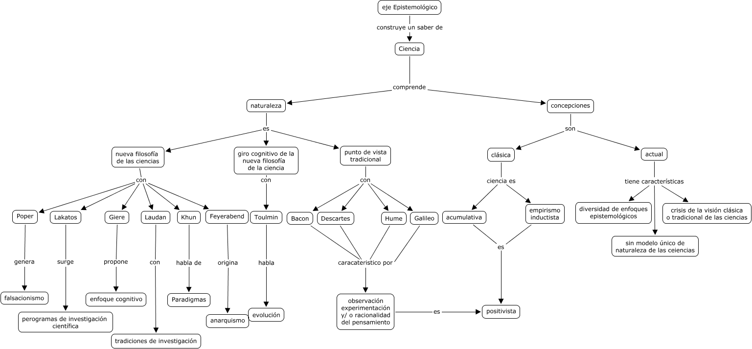 Este Cmap, tiene información relacionada con: eje epistemológico, Khun habla de Paradigmas, actual tiene características diversidad de enfoques epistemológicos, punto de vista tradicional con Descartes, clásica ciencia es empirismo inductista, Galileo caracateristico por observación experimentación y/ o racionalidad del pensamiento, acumulativa es positivista, punto de vista tradicional con Galileo, Feyerabend origina anarquismo, actual tiene características crisis de la visión clásica o tradicional de las ciencias, actual tiene características sin modelo único de naturaleza de las ceiencias, Ciencia comprende naturaleza, naturaleza es punto de vista tradicional, Ciencia comprende concepciones, nueva filosofía de las ciencias con Khun, Toulmin habla evolución, concepciones son actual, naturaleza es nueva filosofía de las ciencias, nueva filosofía de las ciencias con Poper, punto de vista tradicional con Bacon, nueva filosofía de las ciencias con Lakatos