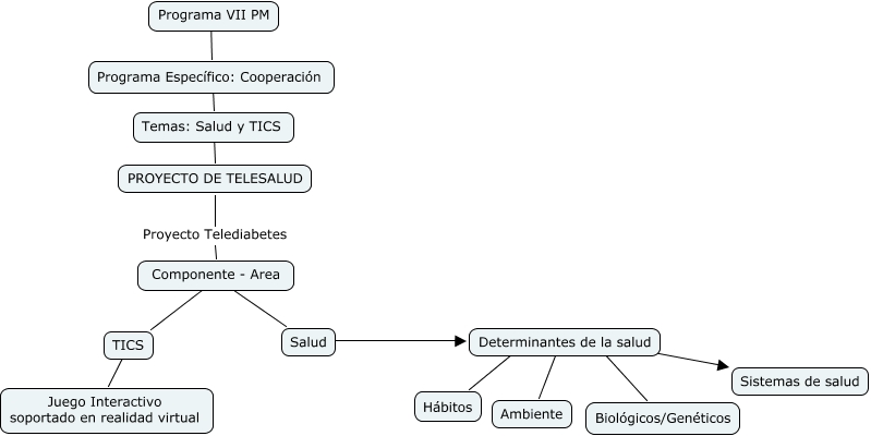 Este Cmap, tiene información relacionada con: PROGRAMA DE TELESALUD, Programa VII PM ???? Programa Específico: Cooperación, Salud ???? Determinantes de la salud, Determinantes de la salud ???? Hábitos, Componente - Area ???? TICS, TICS ???? Juego Interactivo soportado en realidad virtual, Temas: Salud y TICS ???? PROYECTO DE TELESALUD, Programa Específico: Cooperación ???? Temas: Salud y TICS, PROYECTO DE TELESALUD Proyecto Telediabetes Componente - Area, Determinantes de la salud ???? Biológicos/Genéticos, Determinantes de la salud ???? Ambiente, Componente - Area ???? Salud, Determinantes de la salud ???? Sistemas de salud