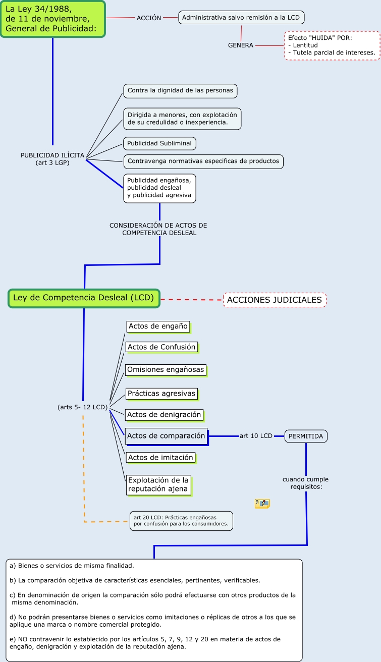 Este Cmap, tiene información relacionada con: CMAPS 5- LEVIS VS CASTER, Ley de Competencia Desleal (LCD) (arts 5- 12 LCD) Actos de Confusión, Actos de comparación art 10 LCD PERMITIDA, Administrativa salvo remisión a la LCD GENERA Efecto "HUIDA" POR: - Lentitud - Tutela parcial de intereses., Ley de Competencia Desleal (LCD) (arts 5- 12 LCD) art 20 LCD: Prácticas engañosas por confusión para los consumidores., Ley de Competencia Desleal (LCD) (arts 5- 12 LCD) Explotación de la reputación ajena, La Ley 34/1988, de 11 de noviembre, General de Publicidad: PUBLICIDAD ILÍCITA (art 3 LGP) Dirigida a menores, con explotación de su credulidad o inexperiencia., La Ley 34/1988, de 11 de noviembre, General de Publicidad: PUBLICIDAD ILÍCITA (art 3 LGP) Contravenga normativas especificas de productos, Ley de Competencia Desleal (LCD) (arts 5- 12 LCD) Actos de denigración, La Ley 34/1988, de 11 de noviembre, General de Publicidad: PUBLICIDAD ILÍCITA (art 3 LGP) Publicidad Subliminal, Ley de Competencia Desleal (LCD) (arts 5- 12 LCD) Actos de engaño, Ley de Competencia Desleal (LCD) (arts 5- 12 LCD) Actos de imitación, La Ley 34/1988, de 11 de noviembre, General de Publicidad: PUBLICIDAD ILÍCITA (art 3 LGP) Contra la dignidad de las personas, PERMITIDA cuando cumple requisitos: a) Bienes o servicios de misma finalidad. b) La comparación objetiva de características esenciales, pertinentes, verificables. c) En denominación de origen la comparación sólo podrá efectuarse con otros productos de la misma denominación. d) No podrán presentarse bienes o servicios como imitaciones o réplicas de otros a los que se aplique una marca o nombre comercial protegido. e) NO contravenir lo establecido por los artículos 5, 7, 9, 12 y 20 en materia de actos de engaño, denigración y explotación de la reputación ajena., Ley de Competencia Desleal (LCD) (arts 5- 12 LCD) Actos de comparación, Ley de Competencia Desleal (LCD) ???? ACCIONES JUDICIALES, Ley de Competencia Desleal (LCD) (arts 5- 12 LCD) Omisiones engañosas, Ley de Competencia Desleal (LCD) (arts 5- 12 LCD) Prácticas agresivas, La Ley 34/1988, de 11 de noviembre, General de Publicidad: PUBLICIDAD ILÍCITA (art 3 LGP) Publicidad engañosa, publicidad desleal y publicidad agresiva, Publicidad engañosa, publicidad desleal y publicidad agresiva CONSIDERACIÓN DE ACTOS DE COMPETENCIA DESLEAL Ley de Competencia Desleal (LCD), La Ley 34/1988, de 11 de noviembre, General de Publicidad: ACCIÓN Administrativa salvo remisión a la LCD