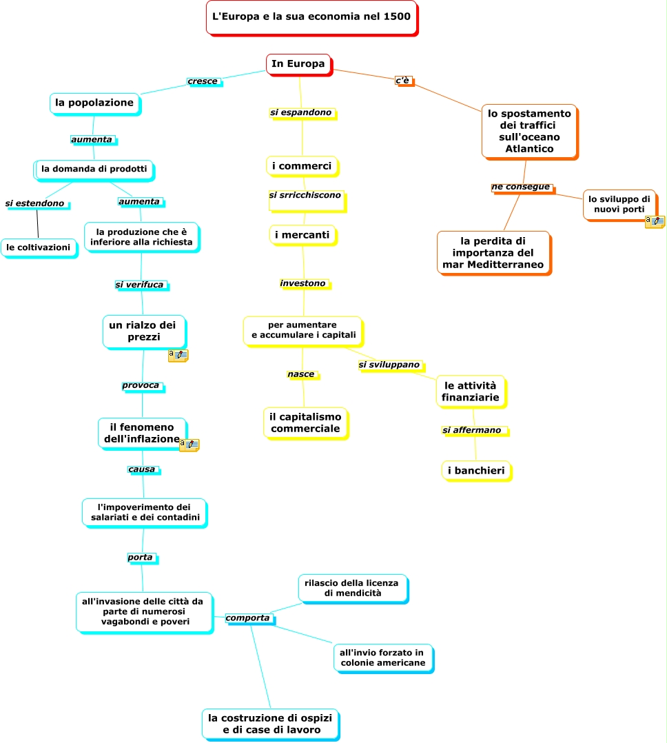 Questa Cmap, creata con IHMC CmapTools, contiene informazioni relative a: L'europa nel 500' di Attolico,Novielli S. e Novielli E, all'invasione delle città da parte di numerosi vagabondi e poveri comporta la costruzione di ospizi e di case di lavoro, la domanda di prodotti aumenta la produzione che è inferiore alla richiesta, all'invasione delle città da parte di numerosi vagabondi e poveri comporta all'invio forzato in colonie americane, i commerci si srricchiscono i mercanti, un rialzo dei prezzi provoca il fenomeno dell'inflazione, In Europa cresce la popolazione, lo spostamento dei traffici sull'oceano Atlantico ne consegue la perdita di importanza del mar Meditterraneo, lo spostamento dei traffici sull'oceano Atlantico ne consegue lo sviluppo di nuovi porti, la popolazione aumenta la domanda di prodotti, all'invasione delle città da parte di numerosi vagabondi e poveri comporta rilascio della licenza di mendicità, i mercanti investono per aumentare e accumulare i capitali, per aumentare e accumulare i capitali nasce il capitalismo commerciale, In Europa c'è lo spostamento dei traffici sull'oceano Atlantico, l'impoverimento dei salariati e dei contadini porta all'invasione delle città da parte di numerosi vagabondi e poveri, la produzione che è inferiore alla richiesta si verifuca un rialzo dei prezzi, il fenomeno dell'inflazione causa l'impoverimento dei salariati e dei contadini, le attività finanziarie si affermano i banchieri, per aumentare e accumulare i capitali si sviluppano le attività finanziarie, la domanda di prodotti si estendono le coltivazioni, In Europa si espandono i commerci