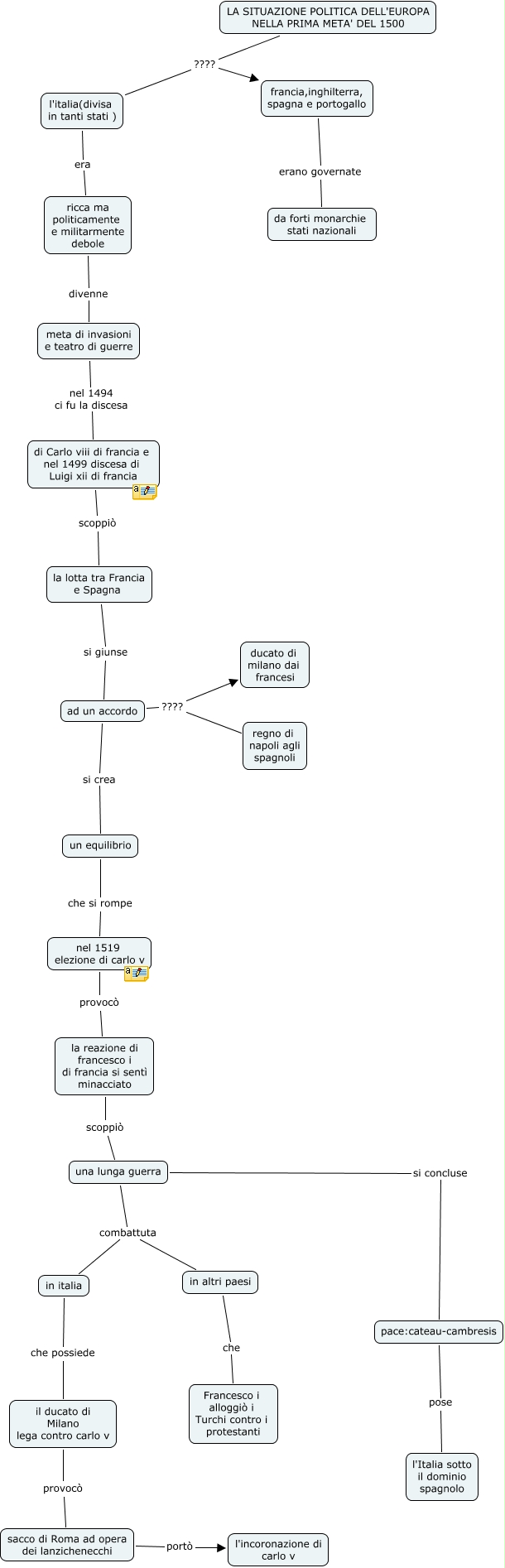 Questa Cmap, creata con IHMC CmapTools, contiene informazioni relative a: la situazione politica dell'europa di Mossa e Di Corrado, in altri paesi che Francesco i alloggiò i Turchi contro i protestanti, meta di invasioni e teatro di guerre nel 1494 ci fu la discesa di Carlo viii di francia e nel 1499 discesa di Luigi xii di francia, LA SITUAZIONE POLITICA DELL'EUROPA NELLA PRIMA META' DEL 1500 ???? l'italia(divisa in tanti stati ), LA SITUAZIONE POLITICA DELL'EUROPA NELLA PRIMA META' DEL 1500 ???? francia,inghilterra, spagna e portogallo, ad un accordo ???? ducato di milano dai francesi, ad un accordo ???? regno di napoli agli spagnoli, nel 1519 elezione di carlo v provocò la reazione di francesco i di francia si sentì minacciato, il ducato di Milano lega contro carlo v provocò sacco di Roma ad opera dei lanzichenecchi, la reazione di francesco i di francia si sentì minacciato scoppiò una lunga guerra, un equilibrio che si rompe nel 1519 elezione di carlo v, una lunga guerra si concluse pace:cateau-cambresis, una lunga guerra combattuta in altri paesi, pace:cateau-cambresis pose l'Italia sotto il dominio spagnolo, sacco di Roma ad opera dei lanzichenecchi portò l'incoronazione di carlo v, ad un accordo si crea un equilibrio, ricca ma politicamente e militarmente debole divenne meta di invasioni e teatro di guerre, di Carlo viii di francia e nel 1499 discesa di Luigi xii di francia scoppiò la lotta tra Francia e Spagna, l'italia(divisa in tanti stati ) era ricca ma politicamente e militarmente debole, la lotta tra Francia e Spagna si giunse ad un accordo, francia,inghilterra, spagna e portogallo erano governate da forti monarchie stati nazionali