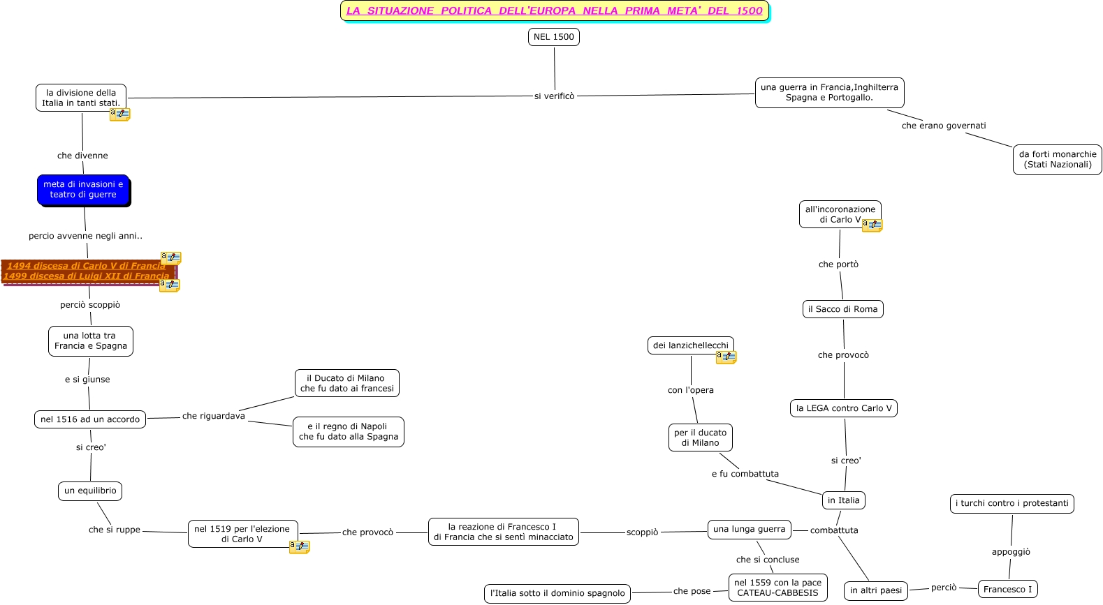 Questa Cmap, creata con IHMC CmapTools, contiene informazioni relative a: la situazione politica dell'europa nella prima metà del 1500 PERNA, la divisione della Italia in tanti stati. che divenne meta di invasioni e teatro di guerre, una lunga guerra combattuta in altri paesi, la reazione di Francesco I di Francia che si sentì minacciato scoppiò una lunga guerra, in altri paesi perciò Francesco I, il Sacco di Roma che portò all'incoronazione di Carlo V, nel 1516 ad un accordo che riguardava e il regno di Napoli che fu dato alla Spagna, una lunga guerra combattuta in Italia, Francesco I appoggiò i turchi contro i protestanti, in Italia e fu combattuta per il ducato di Milano, 1494 discesa di Carlo V di Francia 1499 discesa di Luigi XII di Francia perciò scoppiò una lotta tra Francia e Spagna, nel 1559 con la pace CATEAU-CABBESIS che pose l'Italia sotto il dominio spagnolo, la divisione della Italia in tanti stati. si verificò una guerra in Francia,Inghilterra Spagna e Portogallo., per il ducato di Milano con l'opera dei lanzichellecchi, in Italia si creo' la LEGA contro Carlo V, la LEGA contro Carlo V che provocò il Sacco di Roma, una lotta tra Francia e Spagna e si giunse nel 1516 ad un accordo, meta di invasioni e teatro di guerre percio avvenne negli anni.. 1494 discesa di Carlo V di Francia 1499 discesa di Luigi XII di Francia, un equilibrio che si ruppe nel 1519 per l'elezione di Carlo V, nel 1516 ad un accordo si creo' un equilibrio, la divisione della Italia in tanti stati. si verificò NEL 1500