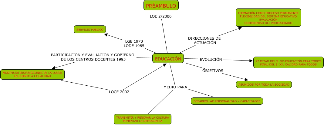 Este Cmap, tiene información relacionada con: MAPA PREÁMBULO, EDUCACIÓN MEDIO PARA TRANSMITIR Y RENOVAR LA CULTURA FOMENTAR LA DEMOCRACIA, EDUCACIÓN OBJETIVOS ASUMIDOS POR TODA LA SOCIEDAD, EDUCACIÓN PARTICIPACIÓN Y EVALUACIÓN Y GOBIERNO DE LOS CENTROS DOCENTES 1995 MODIFICAR DISPOSICIONES DE LA LOGSE EN CUANTO A LA CALIDAD, EDUCACIÓN DIRECCIONES DE ACTUACIÓN FORMACIÓN COMO PROCESO PERMANENTE FLEXIBILIDAD DEL SISTEMA EDUCATIVO EVALUACIÓN COMPROMISO DEL PROFESORADO, EDUCACIÓN EVOLUCIÓN 2º MITAD DEL S. XX-EDUCACIÓN PARA TODOS FINAL DEL S. XX. CALIDAD PARA TODOS, MODIFICAR DISPOSICIONES DE LA LOGSE EN CUANTO A LA CALIDAD LOCE 2002 EDUCACIÓN, DESARROLLAR PERSONALIDAD Y CAPACIDADES MEDIO PARA TRANSMITIR Y RENOVAR LA CULTURA FOMENTAR LA DEMOCRACIA, PRÉAMBULO LOE 2/2006 EDUCACIÓN, EDUCACIÓN LGE 1970 LODE 1985 SERVICIO PÚBLICO