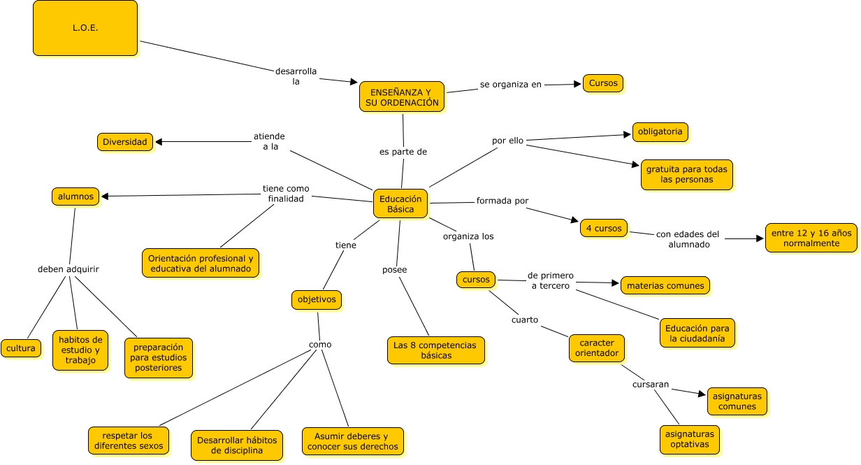 Este Cmap, tiene información relacionada con: MAPA ENSEÑANZAS, caracter orientador cursaran asignaturas optativas, objetivos como Desarrollar hábitos de disciplina, L.O.E. desarrolla la ENSEÑANZA Y SU ORDENACIÓN, Educación Básica atiende a la Diversidad, objetivos como respetar los diferentes sexos, Educación Básica por ello gratuita para todas las personas, cursos cuarto caracter orientador, alumnos deben adquirir habitos de estudio y trabajo, objetivos como Asumir deberes y conocer sus derechos, Educación Básica tiene como finalidad Orientación profesional y educativa del alumnado, caracter orientador cursaran asignaturas comunes, Educación Básica por ello obligatoria, Educación Básica posee Las 8 competencias básicas, 4 cursos con edades del alumnado entre 12 y 16 años normalmente, Educación Básica tiene como finalidad alumnos, ENSEÑANZA Y SU ORDENACIÓN es parte de Educación Básica, Educación Básica organiza los cursos, ENSEÑANZA Y SU ORDENACIÓN se organiza en Cursos, alumnos deben adquirir preparación para estudios posteriores, alumnos deben adquirir cultura