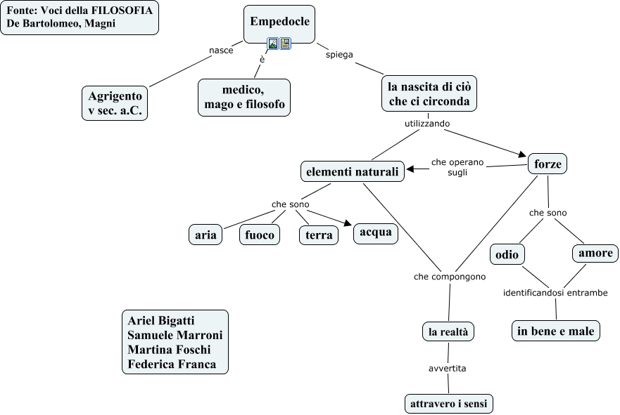 Questa Cmap, creata con IHMC CmapTools, contiene informazioni relative a: Empedocle, forze che compongono la realtà, odio identificandosi entrambe in bene e male, la nascita di ciò che ci circonda utilizzando forze, forze che sono amore, Empedocle è medico, mago e filosofo, Empedocle spiega la nascita di ciò che ci circonda, amore identificandosi entrambe in bene e male, Empedocle nasce Agrigento v sec. a.C., elementi naturali che compongono la realtà, forze che sono odio, elementi naturali che sono aria, la realtà avvertita attravero i sensi, elementi naturali che sono terra, elementi naturali che sono acqua, forze che operano sugli elementi naturali, elementi naturali che sono fuoco, la nascita di ciò che ci circonda utilizzando elementi naturali