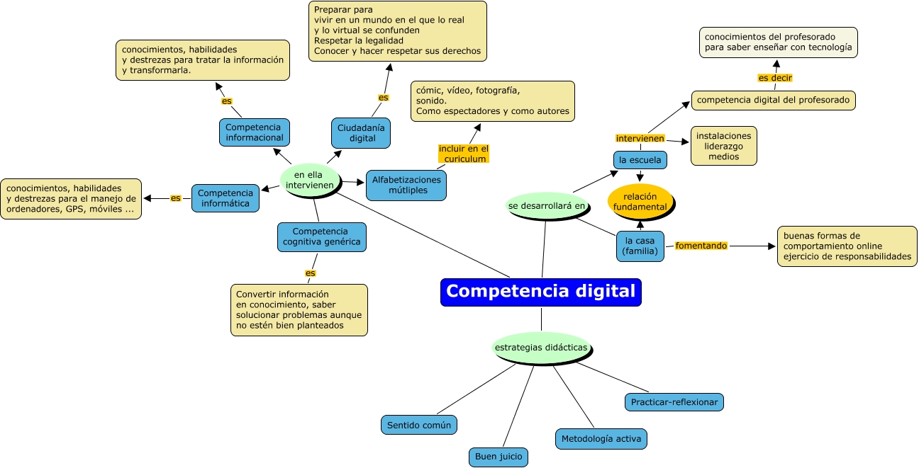 Este Cmap, tiene información relacionada con: competencia digital, Competencia digital estrategias didácticas Practicar-reflexionar, la escuela intervienen competencia digital del profesorado, Competencia digital en ella intervienen Ciudadanía digital, Competencia digital estrategias didácticas Sentido común, Ciudadanía digital es Preparar para vivir en un mundo en el que lo real y lo virtual se confunden Respetar la legalidad Conocer y hacer respetar sus derechos, Competencia digital en ella intervienen Alfabetizaciones mútliples, Competencia digital en ella intervienen Competencia informacional, Competencia digital estrategias didácticas Metodología activa, Competencia digital en ella intervienen Competencia cognitiva genérica, la escuela intervienen instalaciones liderazgo medios, Alfabetizaciones mútliples incluir en el curiculum cómic, vídeo, fotografía, sonido. Como espectadores y como autores, Competencia informacional es conocimientos, habilidades y destrezas para tratar la información y transformarla., Competencia digital se desarrollará en la casa (familia), competencia digital del profesorado es decir conocimientos del profesorado para saber enseñar con tecnología, Competencia informática es conocimientos, habilidades y destrezas para el manejo de ordenadores, GPS, móviles ..., Competencia cognitiva genérica es Convertir información en conocimiento, saber solucionar problemas aunque no estén bien planteados, Competencia digital estrategias didácticas Buen juicio, Competencia digital se desarrollará en la escuela, Competencia digital en ella intervienen Competencia informática, la casa (familia) fomentando buenas formas de comportamiento online ejercicio de responsabilidades