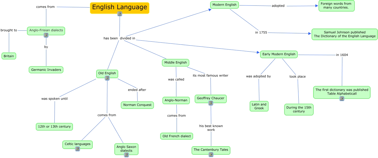 Este Cmap, tiene información relacionada con: English Language, Anglo-Norman comes from Old French dialect, Middle English its most famous writer Geoffrey Chaucer, Geoffrey Chaucer his best known work The Cantenbury Tales, Modern English adopted Foreign words from many countries., Anglo-Frisian dialects by Germanic Invaders, English Language has been divided in Old English, Old English was spoken until 12th or 13th century, English Language has been divided in Early Modern English, Old English comes from Celtic languages, Early Modern English in 1604 The first dictionary was published Table Alphabeticall, English Language has been divided in Middle English, English Language comes from Anglo-Frisian dialects, Anglo-Frisian dialects brought to Britain, Old English ended after Norman Conquest, Middle English was called Anglo-Norman, Early Modern English took place During the 15th century, Old English comes from Anglo Saxon dialects, Early Modern English was adopted by Latin and Greek, Modern English in 1755 Samuel Johnson published The Dictionary of the English Language, English Language has been divided in Modern English