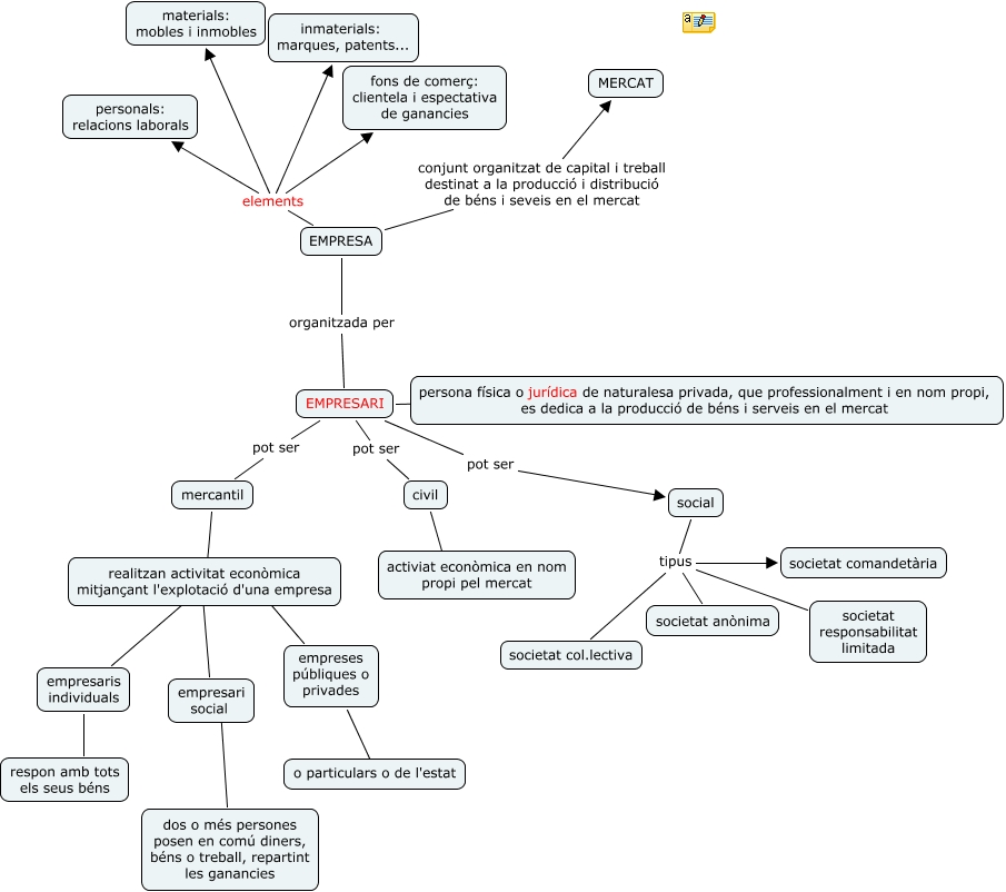 Este Cmap, tiene información relacionada con: EMPRESA, social tipus societat anònima, social tipus societat comandetària, empresaris individuals ???? respon amb tots els seus béns, civil ???? activiat econòmica en nom propi pel mercat, EMPRESA elements fons de comerç: clientela i espectativa de ganancies, empreses públiques o privades ???? o particulars o de l'estat, empresari social ???? dos o més persones posen en comú diners, béns o treball, repartint les ganancies, mercantil ???? realitzan activitat econòmica mitjançant l'explotació d'una empresa, social tipus societat responsabilitat limitada, realitzan activitat econòmica mitjançant l'explotació d'una empresa ???? empresaris individuals, EMPRESA conjunt organitzat de capital i treball destinat a la producció i distribució de béns i seveis en el mercat MERCAT, EMPRESARI pot ser civil, EMPRESA elements inmaterials: marques, patents..., EMPRESA elements materials: mobles i inmobles, social tipus societat col.lectiva, EMPRESA elements personals: relacions laborals, realitzan activitat econòmica mitjançant l'explotació d'una empresa ???? empreses públiques o privades, realitzan activitat econòmica mitjançant l'explotació d'una empresa ???? empresari social, EMPRESARI article 1 codi de comerç persona física o jurídica de naturalesa privada, que professionalment i en nom propi, es dedica a la producció de béns i serveis en el mercat, EMPRESARI pot ser social