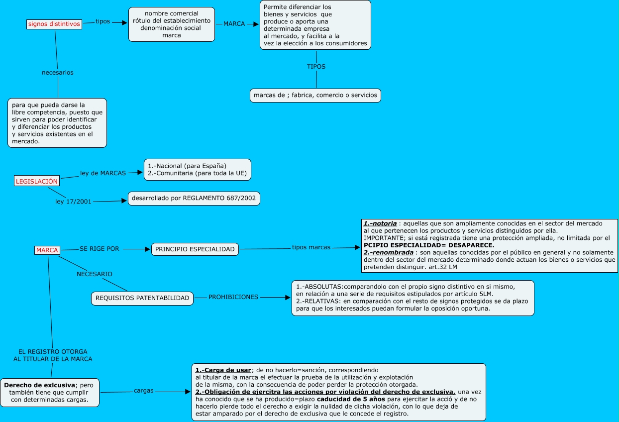 Este Cmap, tiene información relacionada con: CASO PRÁCTICO MARCAS, PRINCIPIO ESPECIALIDAD tipos marcas 1.-notoria: aquellas que son ampliamente conocidas en el sector del mercado al que pertenecen los productos y servicios distinguidos por ella. IMPORTANTE; si está registrada tiene una protección ampliada, no limitada por el PCIPIO ESPECIALIDAD= DESAPARECE. 2.-renombrada: son aquellas conocidas por el público en general y no solamente dentro del sector del mercado determinado donde actuan los bienes o servicios que pretenden distinguir. art.32 LM, REQUISITOS PATENTABILIDAD PROHIBICIONES 1.-ABSOLUTAS:comparandolo con el propio signo distintivo en si mismo, en relación a una serie de requisitos estipulados por artículo 5LM. 2.-RELATIVAS: en comparación con el resto de signos protegidos se da plazo para que los interesados puedan formular la oposición oportuna., Permite diferenciar los bienes y servicios que produce o aporta una determinada empresa al mercado, y facilita a la vez la elección a los consumidores TIPOS marcas de ; fabrica, comercio o servicios, signos distintivos necesarios para que pueda darse la libre competencia, puesto que sirven para poder identificar y diferenciar los productos y servicios existentes en el mercado., LEGISLACIÓN ley de MARCAS 1.-Nacional (para España) 2.-Comunitaria (para toda la UE), nombre comercial rótulo del establecimiento denominación social marca MARCA Permite diferenciar los bienes y servicios que produce o aporta una determinada empresa al mercado, y facilita a la vez la elección a los consumidores, LEGISLACIÓN ley 17/2001 desarrollado por REGLAMENTO 687/2002, Derecho de exlcusiva; pero también tiene que cumplir con determinadas cargas. cargas 1.-Carga de usar; de no hacerlo=sanción, correspondiendo al titular de la marca el efectuar la prueba de la utilización y explotación de la misma, con la consecuencia de poder perder la protección otorgada. 2.-Obligación de ejercitra las acciones por violación del derecho de exclusiva, una vez ha conocido que se ha producido=plazo caducidad de 5 años para ejercitar la acció y de no hacerlo pierde todo el derecho a exigir la nulidad de dicha violación, con lo que deja de estar amparado por el derecho de exclusiva que le concede el registro., signos distintivos tipos nombre comercial rótulo del establecimiento denominación social marca, MARCA NECESARIO REQUISITOS PATENTABILIDAD, MARCA SE RIGE POR PRINCIPIO ESPECIALIDAD, MARCA EL REGISTRO OTORGA AL TITULAR DE LA MARCA Derecho de exlcusiva; pero también tiene que cumplir con determinadas cargas.