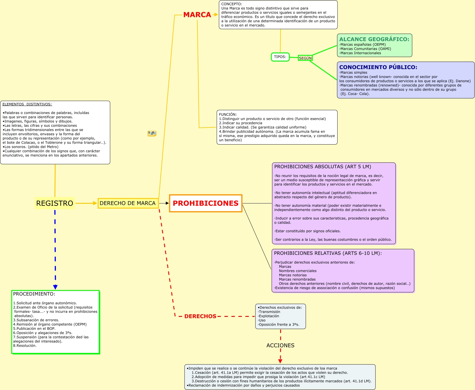Este Cmap, tiene información relacionada con: CMAPS 6- MISTIC, •Derechos exclusivos de: ◦Transmisión ◦Explotación ◦Uso ◦Oposición frente a 3ºs. ACCIONES •Impiden que se realice o se continúe la violación del derecho exclusivo de loa marca 1.Cesación (art. 41.1a LM) permite exigir la cesación de los actos que violen su derecho. 2.Adopción de medidas para impedir que prosiga la violación (art 41.1c LM) 3.Destrucción o cesión con fines humanitarios de los productos ilícitamente marcados (art. 41.1d LM). •Reclamación de indemnización por daños y perjuicios causados, DERECHO DE MARCA MARCA CONCEPTO: Una Marca es todo signo distintivo que sirve para diferenciar productos o servicios iguales o semejantes en el tráfico económico. Es un título que concede el derecho exclusivo a la utilización de una determinada identificación de un producto o servicio en el mercado., ELEMENTOS DISTINTIVOS: •Palabras o combinaciones de palabras, incluídas las que sirven para identificar personas. •Imagenes, figuras, símbolos y dibujos. •Las letras, las cifras y sus combinaciones •Las formas tridimensionales entre las que se incluyen envoltorios, envases y la forma del producto o de su representación (como por ejemplo, el bote de Colacao, o el Toblerone y su forma triangular..). •Los sonoros. (pitido del Metro) •Cualquier combinación de los signos que, con carácter enunciativo, se menciona en los apartados anteriores. REGISTRO DERECHO DE MARCA, CONCEPTO: Una Marca es todo signo distintivo que sirve para diferenciar productos o servicios iguales o semejantes en el tráfico económico. Es un título que concede el derecho exclusivo a la utilización de una determinada identificación de un producto o servicio en el mercado. ???? TIPOS:, ELEMENTOS DISTINTIVOS: •Palabras o combinaciones de palabras, incluídas las que sirven para identificar personas. •Imagenes, figuras, símbolos y dibujos. •Las letras, las cifras y sus combinaciones •Las formas tridimensionales entre las que se incluyen envoltorios, envases y la forma del producto o de su representación (como por ejemplo, el bote de Colacao, o el Toblerone y su forma triangular..). •Los sonoros. (pitido del Metro) •Cualquier combinación de los signos que, con carácter enunciativo, se menciona en los apartados anteriores. REGISTRO PROCEDIMIENTO: 1.Solicitud ante órgano autonómico. 2.Examen de Oficio de la solicitud (requisitos formales- tasa...- y no incurra en prohibiciones absolutas). 3.Subsanación de errores. 4.Remisión al órgano competente (OEPM) 5.Publicación en el BOP. 6.Oposición y alegaciones de 3ºs. 7.Suspensión (para la contestación ded las alegaciones del interesado). 8.Resolución., DERECHO DE MARCA PROHIBICIONES PROHIBICIONES RELATIVAS (ARTS 6-10 LM): ◦Perjudicar derechos exclusivos anteriores de: Marcas Nombres comerciales Marcas notorias Marcas renombradas Otros derechos anteriores (nombre civil, derechos de autor, razón social..) ◦Existencia de riesgo de associación o confusión (mismos supuestos), DERECHO DE MARCA MARCA FUNCIÓN: 1.Distinguir un producto o servicio de otro (función esencial) 2.Indicar su procedencia 3.Indicar calidad. (Se garantiza calidad uniforme) 4.Brindar publicidad autónoma. (La marca acumula fama en sí misma, ese prestigio adquirido queda en la marca, y constituye un beneficio), DERECHO DE MARCA PROHIBICIONES PROHIBICIONES ABSOLUTAS (ART 5 LM) ◦No reunir los requisitos de la noción legal de marca, es decir, ser un medio susceptible de representacción gráfica y servir para identificar los productos y servicios en el mercado. ◦No tener autonomía intelectual (aptitud diferenciadora en abstracto respecto del género de producto). ◦No tener autonomía material (poder existir materialmente e independientemente como algo distinto del producto o servicio. ◦Inducir a error sobre sus caracteristicas, procedencia geográfica o calidad. ◦Estar constituído por signos oficiales. ◦Ser contrarios a la Ley, las buenas costumbres o el orden público., TIPOS: SEGÚN CONOCIMIENTO PÚBLICO: ◦Marcas simples ◦Marcas notorias (well known- conocida en el sector por los consumidores de productos o servicios a los que se aplica (Ej. Danone) ◦Marcas renombradas (renowned)- conocida por diferentes grupos de consumidores en mercados diversos y no sólo dentro de su grupo (Ej. Coca- Cola)., TIPOS: SEGÚN ALCANCE GEOGRÁFICO: ◦Marcas españolas (OEPM) ◦Marcas Comunitarias (OAMI) ◦Marcas Internacionales, DERECHO DE MARCA DERECHOS •Derechos exclusivos de: ◦Transmisión ◦Explotación ◦Uso ◦Oposición frente a 3ºs.