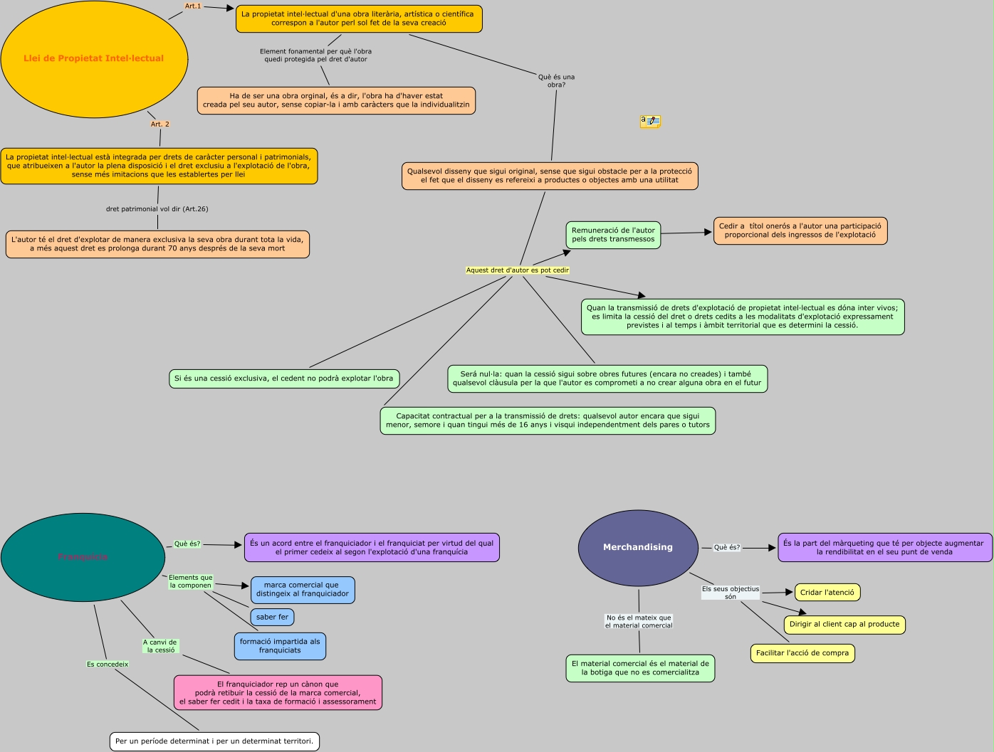 Este Cmap, tiene información relacionada con: escenari 7, Qualsevol disseny que sigui original, sense que sigui obstacle per a la protecció el fet que el disseny es refereixi a productes o objectes amb una utilitat Aquest dret d'autor es pot cedir Capacitat contractual per a la transmissió de drets: qualsevol autor encara que sigui menor, semore i quan tingui més de 16 anys i visqui independentment dels pares o tutors, Merchandising Els seus objectius són Facilitar l'acció de compra, Remuneració de l'autor pels drets transmessos ???? Cedir a títol onerós a l'autor una participació proporcional dels ingressos de l'explotació, Merchandising No és el mateix que el material comercial El material comercial és el material de la botiga que no es comercialitza, Merchandising Els seus objectius són Dirigir al client cap al producte, Franquícia Elements que la componen marca comercial que distingeix al franquiciador, Qualsevol disseny que sigui original, sense que sigui obstacle per a la protecció el fet que el disseny es refereixi a productes o objectes amb una utilitat Aquest dret d'autor es pot cedir Remuneració de l'autor pels drets transmessos, Franquícia A canvi de la cessió El franquiciador rep un cànon que podrà retibuir la cessió de la marca comercial, el saber fer cedit i la taxa de formació i assessorament, Llei de Propietat Intel·lectual Art.1 La propietat intel·lectual d'una obra literària, artística o científica correspon a l'autor perl sol fet de la seva creació, La propietat intel·lectual d'una obra literària, artística o científica correspon a l'autor perl sol fet de la seva creació Element fonamental per què l'obra quedi protegida pel dret d'autor Ha de ser una obra orginal, és a dir, l'obra ha d'haver estat creada pel seu autor, sense copiar-la i amb caràcters que la individualitzin, Merchandising Els seus objectius són Cridar l'atenció, Llei de Propietat Intel·lectual Art. 2 La propietat intel·lectual està integrada per drets de caràcter personal i patrimonials, que atribueixen a l'autor la plena disposició i el dret exclusiu a l'explotació de l'obra, sense més imitacions que les establertes per llei, Qualsevol disseny que sigui original, sense que sigui obstacle per a la protecció el fet que el disseny es refereixi a productes o objectes amb una utilitat Aquest dret d'autor es pot cedir Si és una cessió exclusiva, el cedent no podrà explotar l'obra, Qualsevol disseny que sigui original, sense que sigui obstacle per a la protecció el fet que el disseny es refereixi a productes o objectes amb una utilitat Aquest dret d'autor es pot cedir Será nul·la: quan la cessió sigui sobre obres futures (encara no creades) i també qualsevol clàusula per la que l'autor es comprometi a no crear alguna obra en el futur, Qualsevol disseny que sigui original, sense que sigui obstacle per a la protecció el fet que el disseny es refereixi a productes o objectes amb una utilitat Aquest dret d'autor es pot cedir Quan la transmissió de drets d'explotació de propietat intel·lectual es dóna inter vivos; es limita la cessió del dret o drets cedits a les modalitats d'explotació expressament previstes i al temps i àmbit territorial que es determini la cessió., Franquícia Elements que la componen formació impartida als franquiciats, Franquícia Què és? És un acord entre el franquiciador i el franquiciat per virtud del qual el primer cedeix al segon l'explotació d'una franquícia, La propietat intel·lectual està integrada per drets de caràcter personal i patrimonials, que atribueixen a l'autor la plena disposició i el dret exclusiu a l'explotació de l'obra, sense més imitacions que les establertes per llei dret patrimonial vol dir (Art.26) L'autor té el dret d'explotar de manera exclusiva la seva obra durant tota la vida, a més aquest dret es prolonga durant 70 anys després de la seva mort, La propietat intel·lectual d'una obra literària, artística o científica correspon a l'autor perl sol fet de la seva creació Què és una obra? Qualsevol disseny que sigui original, sense que sigui obstacle per a la protecció el fet que el disseny es refereixi a productes o objectes amb una utilitat, Franquícia Elements que la componen saber fer