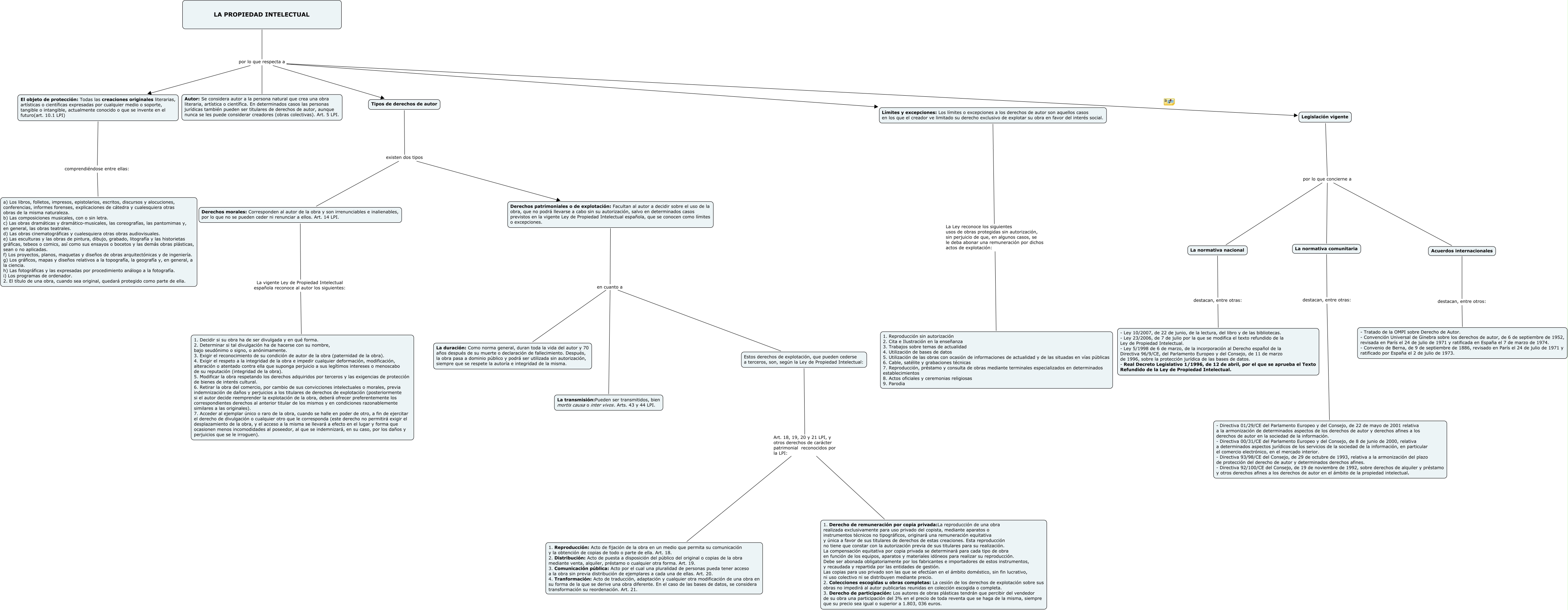 Este Cmap, tiene información relacionada con: Lanas de Picas, Estos derechos de explotación, que pueden cederse a terceros, son, según la Ley de Propiedad Intelectual: Art. 18, 19, 20 y 21 LPI, y otros derechos de carácter patrimonial reconocidos por la LPI: 1. Reproducción: Acto de fijación de la obra en un medio que permita su comunicación y la obtención de copias de todo o parte de ella. Art. 18. 2. Distribución: Acto de puesta a disposición del público del original o copias de la obra mediante venta, alquiler, préstamo o cualquier otra forma. Art. 19. 3. Comunicación pública: Acto por el cual una pluralidad de personas pueda tener acceso a la obra sin previa distribución de ejemplares a cada una de ellas. Art. 20. 4. Tranformación: Acto de traducción, adaptación y cualquier otra modificación de una obra en su forma de la que se derive una obra diferente. En el caso de las bases de datos, se considera transformación su reordenación. Art. 21., LA PROPIEDAD INTELECTUAL por lo que respecta a Límites y excepciones: Los límites o excepciones a los derechos de autor son aquellos casos en los que el creador ve limitado su derecho exclusivo de explotar su obra en favor del interés social., LA PROPIEDAD INTELECTUAL por lo que respecta a Tipos de derechos de autor, El objeto de protección: Todas las creaciones originales literarias, artísticas o científicas expresadas por cualquier medio o soporte, tangible o intangible, actualmente conocido o que se invente en el futuro(art. 10.1 LPI) comprendiéndose entre ellas: a) Los libros, folletos, impresos, epistolarios, escritos, discursos y alocuciones, conferencias, informes forenses, explicaciones de cátedra y cualesquiera otras obras de la misma naturaleza. b) Las composiciones musicales, con o sin letra. c) Las obras dramáticas y dramático-musicales, las coreografías, las pantomimas y, en general, las obras teatrales. d) Las obras cinematográficas y cualesquiera otras obras audiovisuales. e) Las esculturas y las obras de pintura, dibujo, grabado, litografía y las historietas gráficas, tebeos o comics, así como sus ensayos o bocetos y las demás obras plásticas, sean o no aplicadas. f) Los proyectos, planos, maquetas y diseños de obras arquitectónicas y de ingeniería. g) Los gráficos, mapas y diseños relativos a la topografía, la geografía y, en general, a la ciencia. h) Las fotográficas y las expresadas por procedimiento análogo a la fotografía. i) Los programas de ordenador. 2. El título de una obra, cuando sea original, quedará protegido como parte de ella., Derechos patrimoniales o de explotación: Facultan al autor a decidir sobre el uso de la obra, que no podrá llevarse a cabo sin su autorización, salvo en determinados casos previstos en la vigente Ley de Propiedad Intelectual española, que se conocen como límites o excepciones. en cuanto a Estos derechos de explotación, que pueden cederse a terceros, son, según la Ley de Propiedad Intelectual:, Derechos patrimoniales o de explotación: Facultan al autor a decidir sobre el uso de la obra, que no podrá llevarse a cabo sin su autorización, salvo en determinados casos previstos en la vigente Ley de Propiedad Intelectual española, que se conocen como límites o excepciones. en cuanto a La transmisión:Pueden ser transmitidos, bien mortis causa o inter vivos. Arts. 43 y 44 LPI., LA PROPIEDAD INTELECTUAL por lo que respecta a Legislación vigente, Acuerdos internacionales destacan, entre otros: - Tratado de la OMPI sobre Derecho de Autor. - Convención Universal de Ginebra sobre los derechos de autor, de 6 de septiembre de 1952, revisada en París el 24 de julio de 1971 y ratificada en España el 7 de marzo de 1974. - Convenio de Berna, de 9 de septiembre de 1886, revisado en París el 24 de julio de 1971 y ratificado por España el 2 de julio de 1973., LA PROPIEDAD INTELECTUAL por lo que respecta a El objeto de protección: Todas las creaciones originales literarias, artísticas o científicas expresadas por cualquier medio o soporte, tangible o intangible, actualmente conocido o que se invente en el futuro(art. 10.1 LPI), Estos derechos de explotación, que pueden cederse a terceros, son, según la Ley de Propiedad Intelectual: Art. 18, 19, 20 y 21 LPI, y otros derechos de carácter patrimonial reconocidos por la LPI: 1. Derecho de remuneración por copia privada:La reproducción de una obra realizada exclusivamente para uso privado del copista, mediante aparatos o instrumentos técnicos no tipográficos, originará una remuneración equitativa y única a favor de sus titulares de derechos de estas creaciones. Esta reproducción no tiene que constar con la autorización previa de sus titulares para su realización. La compensación equitativa por copia privada se determinará para cada tipo de obra en función de los equipos, aparatos y materiales idóneos para realizar su reproducción. Debe ser abonada obligatoriamente por los fabricantes e importadores de estos instrumentos, y recaudada y repartida por las entidades de gestión. Las copias para uso privado son las que se efectúan en el ámbito doméstico, sin fin lucrativo, ni uso colectivo ni se distribuyen mediante precio. 2. Colecciones escogidas u obras completas: La cesión de los derechos de explotación sobre sus obras no impedirá al autor publicarlas reunidas en colección escogida o completa. 3. Derecho de participación: Los autores de obras plásticas tendrán que percibir del vendedor de su obra una participación del 3% en el precio de toda reventa que se haga de la misma, siempre que su precio sea igual o superior a 1.803, 036 euros., Tipos de derechos de autor existen dos tipos Derechos morales: Corresponden al autor de la obra y son irrenunciables e inalienables, por lo que no se pueden ceder ni renunciar a ellos. Art. 14 LPI., La normativa comunitaria destacan, entre otras: - Directiva 01/29/CE del Parlamento Europeo y del Consejo, de 22 de mayo de 2001 relativa a la 