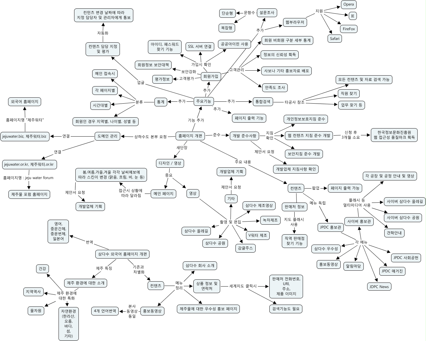 This Concept Map, created with IHMC CmapTools, has information related to: ?��?��?���? 개편 구상, ?��보동?��?�� 본사 ?��?��?�� ?��?�� 4�? ?��?��번역, ?��?���??�� �??��?�� ?��?�� SSL ?���? ?���?, 주요기능 추�?? ?���??��?��???, ?��?�� 촬영 �? ?���? V?��?�� ?���?, ?��메인 �?�? ?���? jejuwater.or.kr, ?��주워?��.or.kr, ?��?��?���? 개편 기능 추�?? 주요기능, 개발 �??��?��?�� �?�? ?��?�� 보안�?�? �??�� 개발, 주요기능 추�?? ?��문조?��, ?��?�� 촬영 �? ?���? 감귤주스, ?��?�� 촬영 �? ?���? ?��?��?�� ?��?���?, ?��?�� ?���? �? ?��?���? ?��계�???�� ?���??�� ?��매처 ?��?��번호, URl, 주소, ?��?�� ?��미�??, ?��?��?�� / ?��?�� 중요 메인 ?��?���?, 주요기능 ?���? 컨텐�? ?��?�� �??�� �? ?���?, ?��문조?�� 문항?�� 복잡?��, 컨텐�? 메뉴 ?���? ?��?�� ?���? �? ?��?���?, ?��?���? ?��보�?? ?��?��?�� ?�� �??��미디?�� ?��?�� ?��?���? ?��?��?�� 공원, ?��?��?���? 개편 �??�� 개발 �??��?��?��, JPDC ?��보�?? �? 메뉴 ?��?��?�� ?��?��?��, ?��?��?�� ?���??�� ?��?��?���? 개편 번역 ?��?��, 중문간체, 중문번체, ?��본어, ?��?��?�� ?���??�� ?��?��?���? 개편 기존�? 차별?�� 컨텐�?
