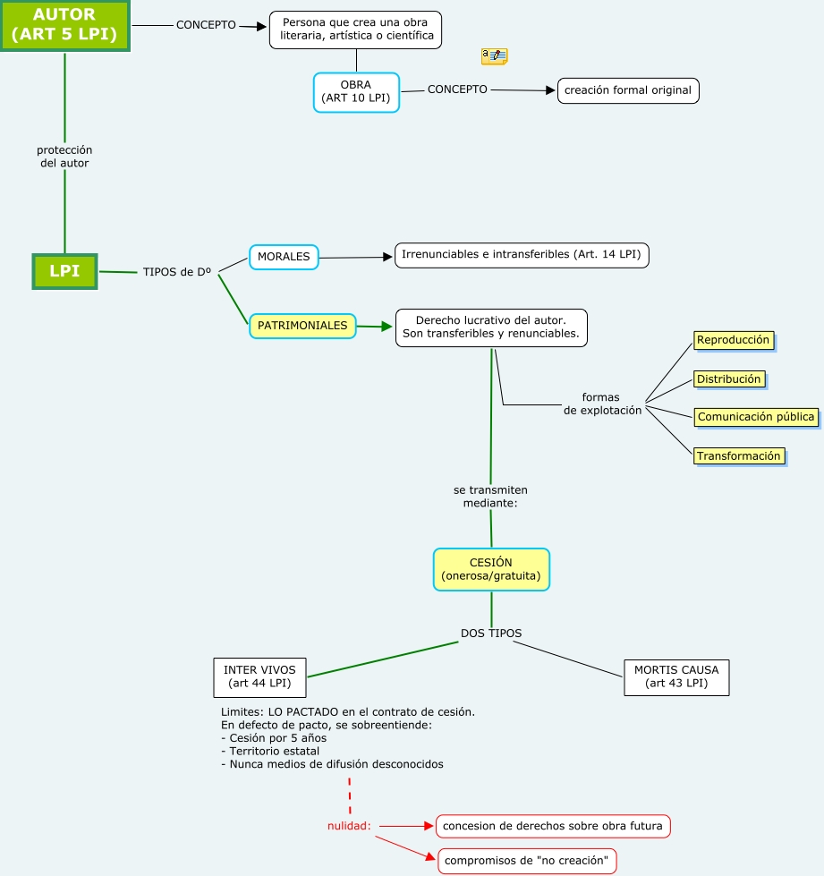 Este Cmap, tiene información relacionada con: CMAPS 7- LANAS DE PICAS, Persona que crea una obra literaria, artística o científica ???? OBRA (ART 10 LPI), LPI TIPOS de Dº MORALES, Limites: LO PACTADO en el contrato de cesión. En defecto de pacto, se sobreentiende: - Cesión por 5 años - Territorio estatal - Nunca medios de difusión desconocidos nulidad: concesion de derechos sobre obra futura, Limites: LO PACTADO en el contrato de cesión. En defecto de pacto, se sobreentiende: - Cesión por 5 años - Territorio estatal - Nunca medios de difusión desconocidos nulidad: compromisos de "no creación", Derecho lucrativo del autor. Son transferibles y renunciables. formas de explotación Comunicación pública, AUTOR (ART 5 LPI) CONCEPTO Persona que crea una obra literaria, artística o científica, MORALES ???? Irrenunciables e intransferibles (Art. 14 LPI), Derecho lucrativo del autor. Son transferibles y renunciables. formas de explotación Distribución, Derecho lucrativo del autor. Son transferibles y renunciables. formas de explotación Transformación, CESIÓN (onerosa/gratuita) DOS TIPOS INTER VIVOS (art 44 LPI), Derecho lucrativo del autor. Son transferibles y renunciables. formas de explotación Reproducción, AUTOR (ART 5 LPI) protección del autor LPI, OBRA (ART 10 LPI) CONCEPTO creación formal original, PATRIMONIALES ???? Derecho lucrativo del autor. Son transferibles y renunciables., LPI TIPOS de Dº PATRIMONIALES, CESIÓN (onerosa/gratuita) DOS TIPOS MORTIS CAUSA (art 43 LPI), AUTOR (ART 5 LPI) CONCEPTO Persona que crea una obra literaria, artística o científica, Derecho lucrativo del autor. Son transferibles y renunciables. se transmiten mediante: CESIÓN (onerosa/gratuita)