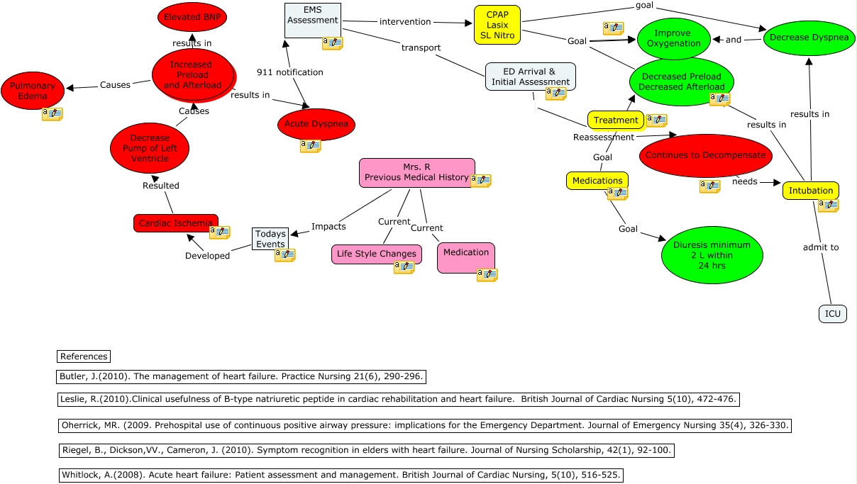 This Concept Map, created with IHMC CmapTools, has information related to: Acute Heart Failure Case Map, ED Arrival & Initial Assessment Treatment, CPAP Lasix SL Nitro goal Decrease Dyspnea, CPAP Lasix SL Nitro Goal Improve Oxygenation, Acute Dyspnea 911 notification EMS Assessment, Intubation admit to ICU, Decrease Pump of Left Ventricle Causes Increased Preload and Afterload, Mrs. R Previous Medical History Current Life Style Changes, Increased Preload and Afterload Causes Pulmonary Edema, Continues to Decompensate needs Intubation, Increased Preload and Afterload results in Acute Dyspnea, CPAP Lasix SL Nitro Goal Decreased Preload Decreased Afterload, Treatment Reassessment Continues to Decompensate, Increased Preload and Afterload results in Elevated BNP, Todays Events Developed Cardiac Ischemia, Mrs. R Previous Medical History Current Medication, Medications Goal Decreased Preload Decreased Afterload, CPAP Lasix SL Nitro Goal Improve Oxygenation, EMS Assessment intervention CPAP Lasix SL Nitro, Decrease Dyspnea and Improve Oxygenation, EMS Assessment transport ED Arrival & Initial Assessment