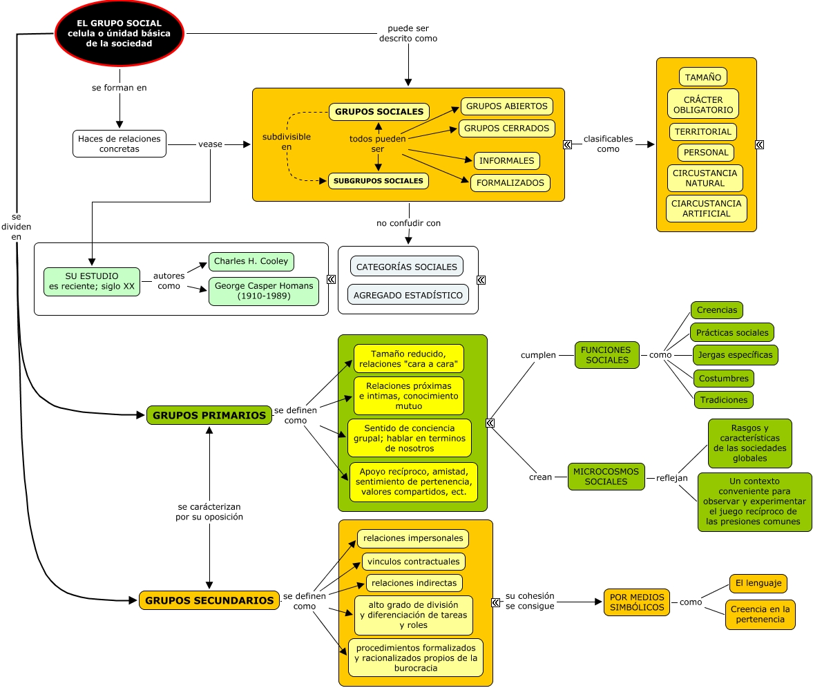 Este Cmap, tiene información relacionada con: Los grupos sociales, EL GRUPO SOCIAL celula o únidad básica de la sociedad puede ser descrito como descripción de los GRUPOS SOCIALES, descripción de los GRUPOS SOCIALES clasificables como Clasificaciones de grupos, GRUPOS SECUNDARIOS se definen como vinculos contractuales, Haces de relaciones concretas vease SU ESTUDIO es reciente; siglo XX, descripción de los GRUPOS SOCIALES no confudir con No confundir con, FUNCIONES SOCIALES como Prácticas sociales, FUNCIONES SOCIALES como Costumbres, DEFINICIONES crean MICROCOSMOS SOCIALES, GRUPOS PRIMARIOS se definen como Relaciones próximas e intimas, conocimiento mutuo, POR MEDIOS SIMBÓLICOS como Creencia en la pertenencia, GRUPOS SECUNDARIOS se definen como relaciones indirectas, GRUPOS PRIMARIOS se definen como Tamaño reducido, relaciones "cara a cara", GRUPOS PRIMARIOS se definen como Apoyo recíproco, amistad, sentimiento de pertenencia, valores compartidos, ect., EL GRUPO SOCIAL celula o únidad básica de la sociedad se forman en Haces de relaciones concretas, MICROCOSMOS SOCIALES reflejan Un contexto conveniente para observar y experimentar el juego recíproco de las presiones comunes, GRUPOS PRIMARIOS se definen como Sentido de conciencia grupal; hablar en terminos de nosotros, DEFINICIONES cumplen FUNCIONES SOCIALES, FUNCIONES SOCIALES como Jergas específicas, EL GRUPO SOCIAL celula o únidad básica de la sociedad se dividen en GRUPOS PRIMARIOS, Haces de relaciones concretas vease descripción de los GRUPOS SOCIALES