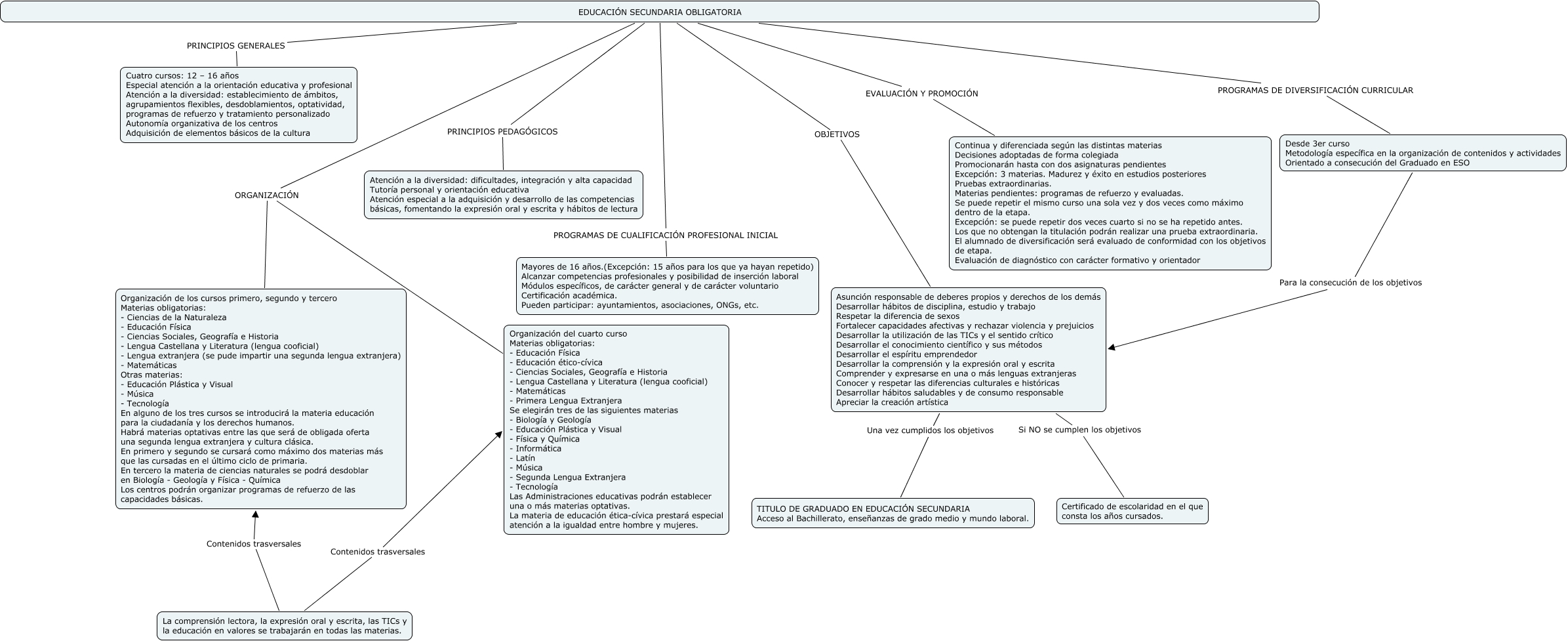 Este Cmap, tiene información relacionada con: Educación Secundaria Obligatoria LOE, EDUCACIÓN SECUNDARIA OBLIGATORIA EVALUACIÓN Y PROMOCIÓN Continua y diferenciada según las distintas materias Decisiones adoptadas de forma colegiada Promocionarán hasta con dos asignaturas pendientes Excepción: 3 materias. Madurez y éxito en estudios posteriores Pruebas extraordinarias. Materias pendientes: programas de refuerzo y evaluadas. Se puede repetir el mismo curso una sola vez y dos veces como máximo dentro de la etapa. Excepción: se puede repetir dos veces cuarto si no se ha repetido antes. Los que no obtengan la titulación podrán realizar una prueba extraordinaria. El alumnado de diversificación será evaluado de conformidad con los objetivos de etapa. Evaluación de diagnóstico con carácter formativo y orientador, EDUCACIÓN SECUNDARIA OBLIGATORIA PRINCIPIOS PEDAGÓGICOS Atención a la diversidad: dificultades, integración y alta capacidad Tutoría personal y orientación educativa Atención especial a la adquisición y desarrollo de las competencias básicas, fomentando la expresión oral y escrita y hábitos de lectura, Asunción responsable de deberes propios y derechos de los demás Desarrollar hábitos de disciplina, estudio y trabajo Respetar la diferencia de sexos Fortalecer capacidades afectivas y rechazar violencia y prejuicios Desarrollar la utilización de las TICs y el sentido crítico Desarrollar el conocimiento científico y sus métodos Desarrollar el espíritu emprendedor Desarrollar la comprensión y la expresión oral y escrita Comprender y expresarse en una o más lenguas extranjeras Conocer y respetar las diferencias culturales e históricas Desarrollar hábitos saludables y de consumo responsable Apreciar la creación artística Una vez cumplidos los objetivos TITULO DE GRADUADO EN EDUCACIÓN SECUNDARIA Acceso al Bachillerato, enseñanzas de grado medio y mundo laboral., EDUCACIÓN SECUNDARIA OBLIGATORIA PROGRAMAS DE CUALIFICACIÓN PROFESIONAL INICIAL Mayores de 16 años.(Excepción: 15 años para los que ya hayan repetido) Alcanzar competencias profesionales y posibilidad de inserción laboral Módulos específicos, de carácter general y de carácter voluntario Certificación académica. Pueden participar: ayuntamientos, asociaciones, ONGs, etc., EDUCACIÓN SECUNDARIA OBLIGATORIA PROGRAMAS DE DIVERSIFICACIÓN CURRICULAR Desde 3er curso Metodología específica en la organización de contenidos y actividades Orientado a consecución del Graduado en ESO, EDUCACIÓN SECUNDARIA OBLIGATORIA PRINCIPIOS GENERALES Cuatro cursos: 12 – 16 años Especial atención a la orientación educativa y profesional Atención a la diversidad: establecimiento de ámbitos, agrupamientos flexibles, desdoblamientos, optatividad, programas de refuerzo y tratamiento personalizado Autonomía organizativa de los centros Adquisición de elementos básicos de la cultura, Desde 3er curso Metodología específica en la organización de contenidos y actividades Orientado a consecución del Graduado en ESO Para la consecución de los objetivos Asunción responsable de deberes propios y derechos de los demás Desarrollar hábitos de disciplina, estudio y trabajo Respetar la diferencia de sexos Fortalecer capacidades afectivas y rechazar violencia y prejuicios Desarrollar la utilización de las TICs y el sentido crítico Desarrollar el conocimiento científico y sus métodos Desarrollar el espíritu emprendedor Desarrollar la comprensión y la expresión oral y escrita Comprender y expresarse en una o más lenguas extranjeras Conocer y respetar las diferencias culturales e históricas Desarrollar hábitos saludables y de consumo responsable Apreciar la creación artística, EDUCACIÓN SECUNDARIA OBLIGATORIA ORGANIZACIÓN Organización de los cursos primero, segundo y tercero Materias obligatorias: - Ciencias de la Naturaleza - Educación Física - Ciencias Sociales, Geografía e Historia - Lengua Castellana y Literatura (lengua cooficial) - Lengua extranjera (se pude impartir una segunda lengua extranjera) - Matemáticas Otras materias: - Educación Plástica y Visual - Música - Tecnología En alguno de los tres cursos se introducirá la materia educación para la ciudadanía y los derechos humanos. Habrá materias optativas entre las que será de obligada oferta una segunda lengua extranjera y cultura clásica. En primero y segundo se cursará como máximo dos materias más que las cursadas en el último ciclo de primaria. En tercero la materia de ciencias naturales se podrá desdoblar en Biología - Geología y Física - Química Los centros podrán organizar programas de refuerzo de las capacidades básicas., La comprensión lectora, la expresión oral y escrita, las TICs y la educación en valores se trabajarán en todas las materias. Contenidos trasversales Organización del cuarto curso Materias obligatorias: - Educación Física - Educación ético-cívica - Ciencias Sociales, Geografía e Historia - Lengua Castellana y Literatura (lengua cooficial) - Matemáticas - Primera Lengua Extranjera Se elegirán tres de las siguientes materias - Biología y Geología - Educación Plástica y Visual - Física y Química - Informática - Latín - Música - Segunda Lengua Extranjera - Tecnología Las Administraciones educativas podrán establecer una o más materias optativas. La materia de educación ética-cívica prestará especial atención a la igualdad entre hombre y mujeres., La comprensión lectora, la expresión oral y escrita, las TICs y la educación en valores se trabajarán en todas las materias. Contenidos trasversales Organización de los cursos primero, segundo y tercero Materias obligatorias: - Ciencias de la Naturaleza - Educación Física - Ciencias Sociales, Geografía e Historia - Lengua Castellana y Literatura (lengua cooficial) - Lengua extranjera (se pude impartir una segunda lengua extranjera) - Matemáticas Otras materias: - Educación Plástica y Visual - Música - 