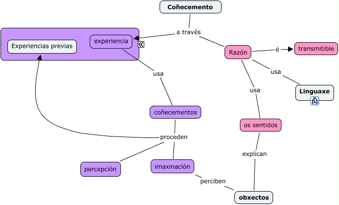 Este Cmap, tiene información relacionada con: trabajo filosofico, coñecementos proceden imaxinación, experiencia usa coñecementos, coñecementos proceden Experiencias previas, os sentidos explican obxectos, Coñecemento a través experiencia, coñecementos proceden percepción, Razón usa Linguaxe, Razón usa os sentidos, imaxinación perciben obxectos, Razón é transmitible, Coñecemento a través Razón