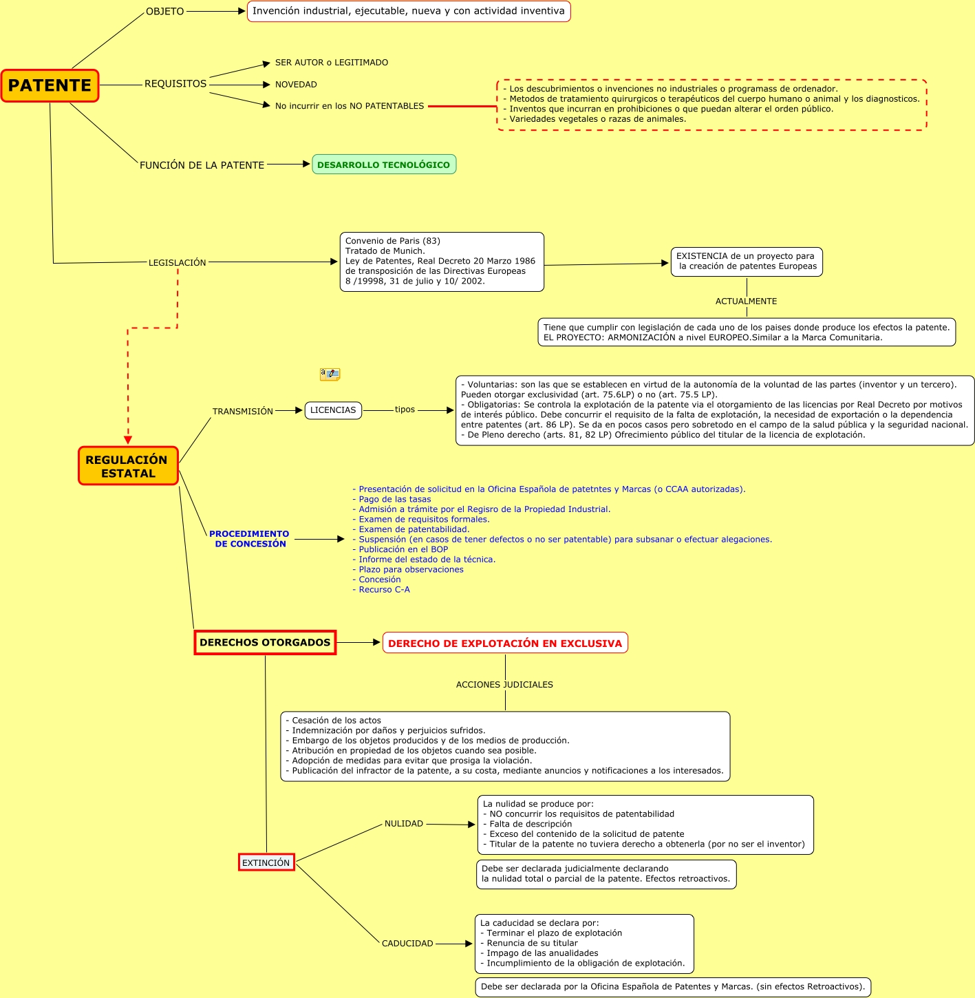 Este Cmap, tiene información relacionada con: CMAPS 8- ROBAFAVES, LICENCIAS tipos - Voluntarias: son las que se establecen en virtud de la autonomía de la voluntad de las partes (inventor y un tercero). Pueden otorgar exclusividad (art. 75.6LP) o no (art. 75.5 LP). - Obligatorias: Se controla la explotación de la patente via el otorgamiento de las licencias por Real Decreto por motivos de interés público. Debe concurrir el requisito de la falta de explotación, la necesidad de exportación o la dependencia entre patentes (art. 86 LP). Se da en pocos casos pero sobretodo en el campo de la salud pública y la seguridad nacional. - De Pleno derecho (arts. 81, 82 LP) Ofrecimiento público del titular de la licencia de explotación., Convenio de Paris (83) Tratado de Munich. Ley de Patentes, Real Decreto 20 Marzo 1986 de transposición de las Directivas Europeas 8 /19998, 31 de julio y 10/ 2002. ???? EXISTENCIA de un proyecto para la creación de patentes Europeas, EXISTENCIA de un proyecto para la creación de patentes Europeas ACTUALMENTE Tiene que cumplir con legislación de cada uno de los paises donde produce los efectos la patente. EL PROYECTO: ARMONIZACIÓN a nivel EUROPEO.Similar a la Marca Comunitaria., PATENTE OBJETO Invención industrial, ejecutable, nueva y con actividad inventiva, PATENTE REQUISITOS SER AUTOR o LEGITIMADO, PATENTE LEGISLACIÓN REGULACIÓN ESTATAL, PATENTE FUNCIÓN DE LA PATENTE DESARROLLO TECNOLÓGICO, EXTINCIÓN NULIDAD La nulidad se produce por: - NO concurrir los requisitos de patentabilidad - Falta de descripción - Exceso del contenido de la solicitud de patente - Titular de la patente no tuviera derecho a obtenerla (por no ser el inventor), DERECHO DE EXPLOTACIÓN EN EXCLUSIVA ACCIONES JUDICIALES - Cesación de los actos - Indemnización por daños y perjuicios sufridos. - Embargo de los objetos producidos y de los medios de producción. - Atribución en propiedad de los objetos cuando sea posible. - Adopción de medidas para evitar que prosiga la violación. - Publicación del infractor de la patente, a su costa, mediante anuncios y notificaciones a los interesados., REGULACIÓN ESTATAL DERECHOS OTORGADOS EXTINCIÓN, PATENTE REQUISITOS No incurrir en los NO PATENTABLES, EXTINCIÓN CADUCIDAD La caducidad se declara por: - Terminar el plazo de explotación - Renuncia de su titular - Impago de las anualidades - Incumplimiento de la obligación de explotación., PATENTE LEGISLACIÓN Convenio de Paris (83) Tratado de Munich. Ley de Patentes, Real Decreto 20 Marzo 1986 de transposición de las Directivas Europeas 8 /19998, 31 de julio y 10/ 2002., No incurrir en los NO PATENTABLES ???? - Los descubrimientos o invenciones no industriales o programass de ordenador. - Metodos de tratamiento quirurgicos o terapéuticos del cuerpo humano o animal y los diagnosticos. - Inventos que incurran en prohibiciones o que puedan alterar el orden público. - Variedades vegetales o razas de animales., REGULACIÓN ESTATAL PROCEDIMIENTO DE CONCESIÓN - Presentación de solicitud en la Oficina Española de patetntes y Marcas (o CCAA autorizadas). - Pago de las tasas - Admisión a trámite por el Regisro de la Propiedad Industrial. - Examen de requisitos formales. - Examen de patentabilidad. - Suspensión (en casos de tener defectos o no ser patentable) para subsanar o efectuar alegaciones. - Publicación en el BOP - Informe del estado de la técnica. - Plazo para observaciones - Concesión - Recurso C-A, PATENTE REQUISITOS NOVEDAD, REGULACIÓN ESTATAL DERECHOS OTORGADOS DERECHO DE EXPLOTACIÓN EN EXCLUSIVA, REGULACIÓN ESTATAL TRANSMISIÓN LICENCIAS