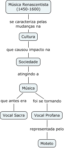 Esse mapa conceitual, produzido no IHMC CmapTools, tem a informação relacionada a: Vocal Profana, Sociedade atingindo a Música, Vocal Profana representada pelo Moteto, Música foi se tornando Vocal Profana, Música que antes era Vocal Sacra, Música Renascentista (1450-1600) se caracteriza pelas mudanças na Cultura, Cultura que causou impacto na Sociedade