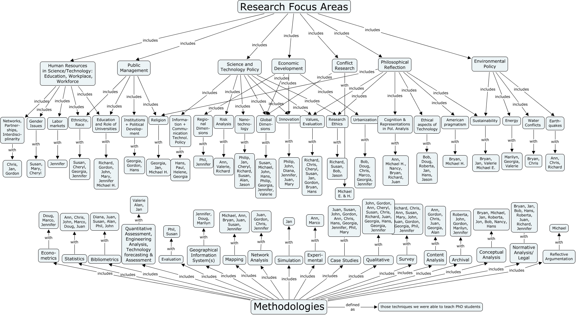 Esse mapa conceitual, produzido no IHMC CmapTools, tem a informação relacionada a: SPP Focus areas_3a, Human Resources in Science/Technology: Education, Workplace, Workforce includes Gender Issues, Methodologies includes Statistics, Methodologies includes Geographical Information System(s), Risk Analysis with Ann, Valerie, Richard, Science and Technology Policy includes Values, Evaluation, Methodologies includes Survey, Urbanization with Bob, Doug, Chris, Marco, Georgia, Jennifer, Public Management includes Religion, Energy with Marilyn, Georgia, Valerie, Research Focus Areas includes Economic Development, Public Management includes Institutions + Political Develop- ment, Labor markets with Jennifer, Statistics with Ann, Chris, John, Marco, Doug, Juan, Philosophical Reflection includes Ethical aspects of Technology, Human Resources in Science/Technology: Education, Workplace, Workforce includes Education and Role of Universities, Case Studies with Juan, Susan, John, Gordon, Ann, Chris, Hans, Georgia, Jennifer, Phil, Mary, Methodologies includes Conceptual Analysis, Research Focus Areas includes Conflict Research, Human Resources in Science/Technology: Education, Workplace, Workforce includes Labor markets, Geographical Information System(s) with Jennifer, Doug, Marilyn