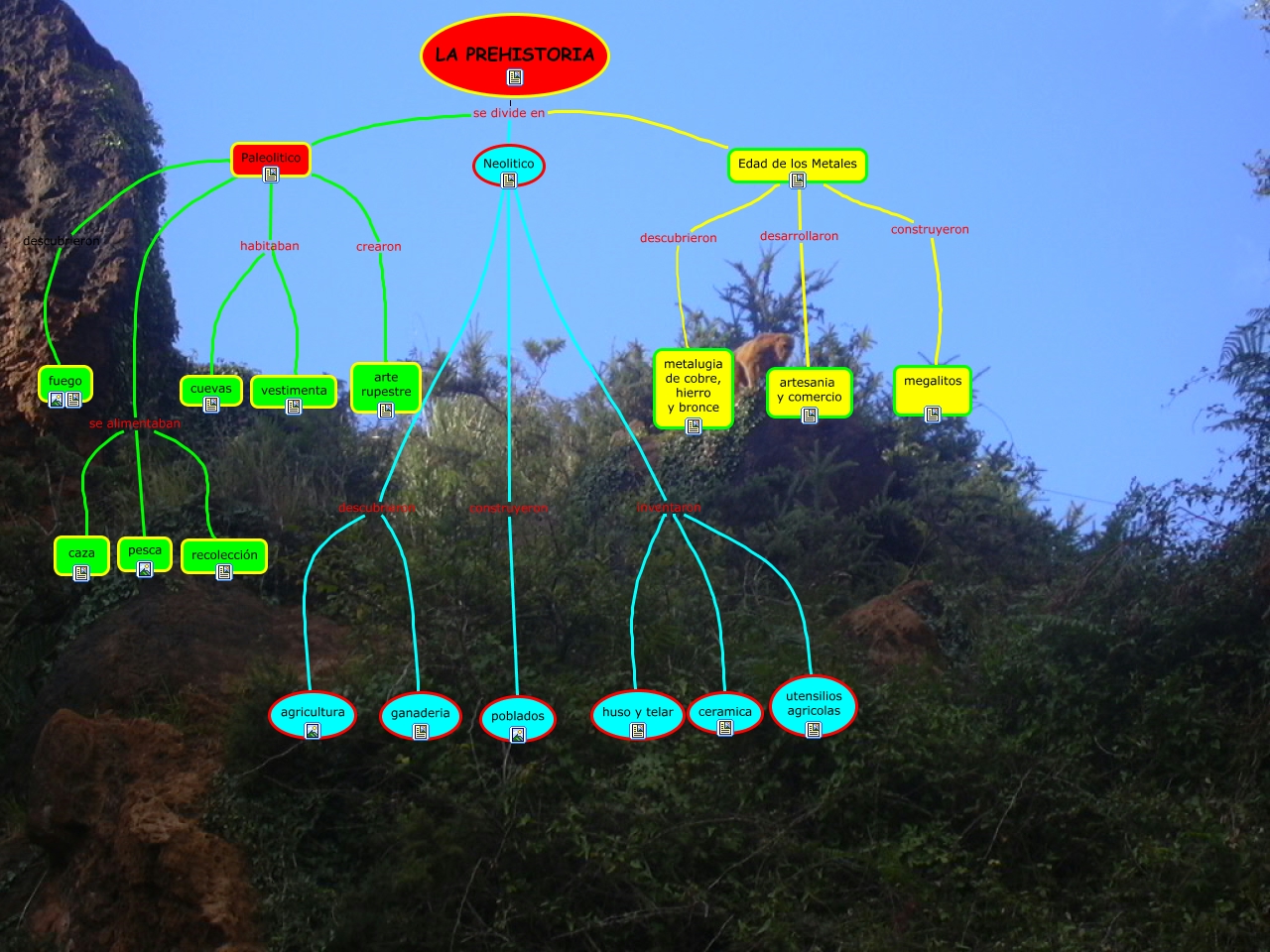Este Cmap, tiene información relacionada con: la prehistoria, Paleolitico se alimentaban caza, Neolitico inventaron ceramica, Neolitico descubrieron ganaderia, Paleolitico habitaban cuevas, Neolitico inventaron huso y telar, Neolitico inventaron utensilios agricolas, Neolitico descubrieron agricultura, Paleolitico se alimentaban pesca, LA PREHISTORIA se divide en Neolitico, Paleolitico se alimentaban recolección, LA PREHISTORIA se divide en Paleolitico, Paleolitico crearon arte rupestre, Edad de los Metales desarrollaron artesania y comercio, Paleolitico descubrieron fuego, Edad de los Metales construyeron megalitos, Neolitico construyeron poblados, Edad de los Metales descubrieron metalugia de cobre, hierro y bronce, Paleolitico habitaban vestimenta, LA PREHISTORIA se divide en Edad de los Metales
