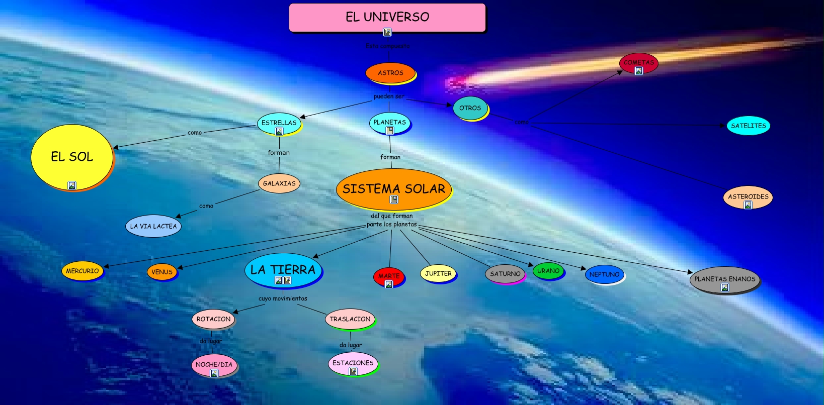 Este Cmap, tiene información relacionada con: EL UNIVERSO, OTROS como SATELITES, EL UNIVERSO Esta compuesto ASTROS, ASTROS pueden ser OTROS, OTROS como COMETAS, SISTEMA SOLAR del que forman parte los planetas PLANETAS ENANOS, SISTEMA SOLAR del que forman parte los planetas MARTE, SISTEMA SOLAR del que forman parte los planetas SATURNO, ASTROS pueden ser PLANETAS, SISTEMA SOLAR del que forman parte los planetas NEPTUNO, SISTEMA SOLAR del que forman parte los planetas MERCURIO, SISTEMA SOLAR del que forman parte los planetas VENUS, LA TIERRA cuyo movimientos ROTACION, GALAXIAS como LA VIA LACTEA, LA TIERRA cuyo movimientos TRASLACION, ROTACION da lugar NOCHE/DIA, SISTEMA SOLAR del que forman parte los planetas JUPITER, ESTRELLAS como EL SOL, SISTEMA SOLAR del que forman parte los planetas LA TIERRA, ESTRELLAS forman GALAXIAS, ASTROS pueden ser ESTRELLAS