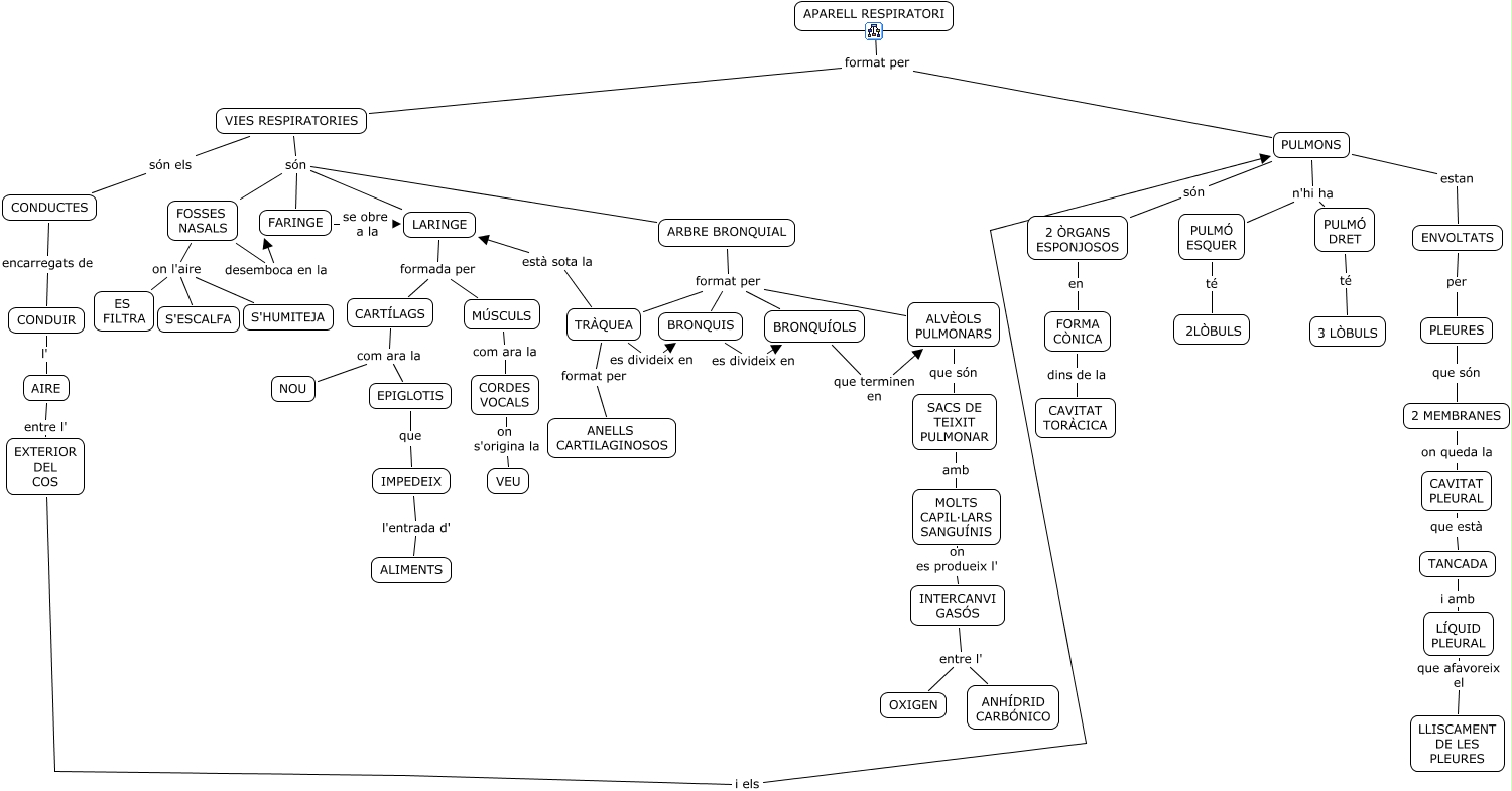 Este Cmap, tiene información relacionada con: ap_respir_munt, PLEURES que són 2 MEMBRANES, 2 ÒRGANS ESPONJOSOS en FORMA CÒNICA, TANCADA i amb LÍQUID PLEURAL, ARBRE BRONQUIAL format per BRONQUÍOLS, CARTÍLAGS com ara la EPIGLOTIS, FARINGE se obre a la LARINGE, SACS DE TEIXIT PULMONAR amb MOLTS CAPIL·LARS SANGUÍNIS, ARBRE BRONQUIAL format per ALVÈOLS PULMONARS, VIES RESPIRATORIES són FARINGE, BRONQUÍOLS que terminen en ALVÈOLS PULMONARS, ARBRE BRONQUIAL format per TRÀQUEA, LÍQUID PLEURAL que afavoreix el LLISCAMENT DE LES PLEURES, CONDUCTES encarregats de CONDUIR, MÚSCULS com ara la CORDES VOCALS, PULMONS són 2 ÒRGANS ESPONJOSOS, EXTERIOR DEL COS i els PULMONS, PULMONS n'hi ha PULMÓ ESQUER, LARINGE formada per MÚSCULS, ARBRE BRONQUIAL format per BRONQUIS, 2 MEMBRANES on queda la CAVITAT PLEURAL