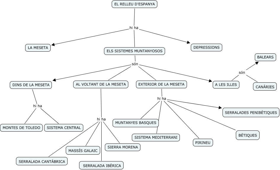 Este Cmap, tiene información relacionada con: RELLEU, ELS SISTEMES MUNTANYOSOS són AL VOLTANT DE LA MESETA, AL VOLTANT DE LA MESETA hi ha SIERRA MORENA, ELS SISTEMES MUNTANYOSOS són DINS DE LA MESETA, EXTERIOR DE LA MESETA hi ha PIRINEU, EL RELLEU D'ESPANYA hi ha DEPRESSIONS, ELS SISTEMES MUNTANYOSOS són EXTERIOR DE LA MESETA, DINS DE LA MESETA hi ha MONTES DE TOLEDO, EL RELLEU D'ESPANYA hi ha ELS SISTEMES MUNTANYOSOS, EXTERIOR DE LA MESETA hi ha MUNTANYES BASQUES, ELS SISTEMES MUNTANYOSOS són A LES ILLES, A LES ILLES són CANÀRIES, EXTERIOR DE LA MESETA hi ha BÈTIQUES, A LES ILLES són BALEARS, AL VOLTANT DE LA MESETA hi ha SERRALADA CANTÀBRICA, DINS DE LA MESETA hi ha SISTEMA CENTRAL, EXTERIOR DE LA MESETA hi ha SERRALADES PENIBÉTIQUES, AL VOLTANT DE LA MESETA hi ha MASSÍS GALAIC, AL VOLTANT DE LA MESETA hi ha SERRALADA IBÈRICA, EXTERIOR DE LA MESETA hi ha SISTEMA MEDITERRANI, EL RELLEU D'ESPANYA hi ha LA MESETA