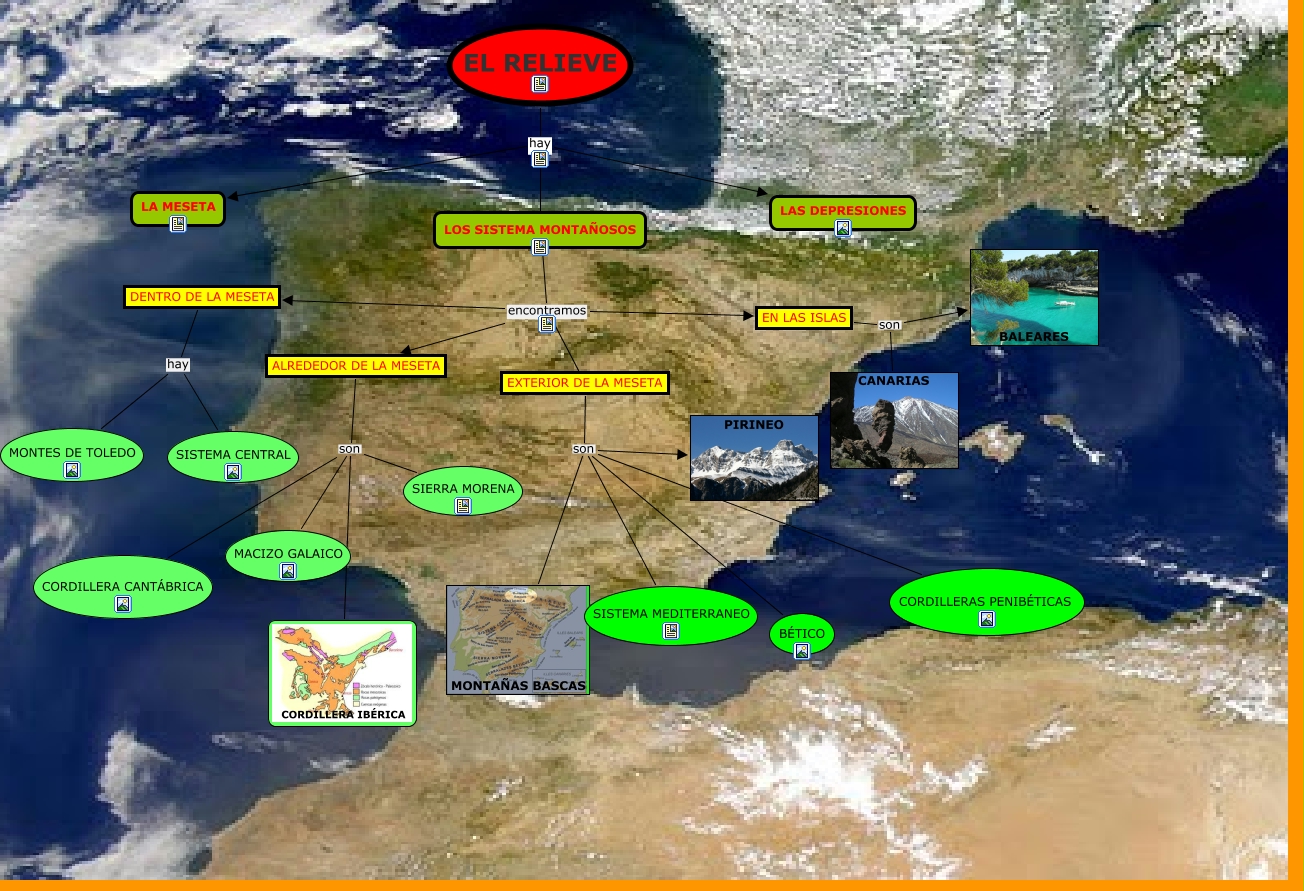 Este Cmap, tiene información relacionada con: RELIEVE DE ESPAÑA_Montserrat Carrilero, LOS SISTEMA MONTAÑOSOS encontramos ALREDEDOR DE LA MESETA, ALREDEDOR DE LA MESETA son SIERRA MORENA, LOS SISTEMA MONTAÑOSOS encontramos EN LAS ISLAS, LOS SISTEMA MONTAÑOSOS encontramos DENTRO DE LA MESETA, EXTERIOR DE LA MESETA son PIRINEO, EL RELIEVE hay LAS DEPRESIONES, LOS SISTEMA MONTAÑOSOS encontramos EXTERIOR DE LA MESETA, DENTRO DE LA MESETA hay MONTES DE TOLEDO, EL RELIEVE hay LOS SISTEMA MONTAÑOSOS, EXTERIOR DE LA MESETA son MONTAÑAS BASCAS, EL RELIEVE hay LA MESETA, EN LAS ISLAS son CANARIAS, EXTERIOR DE LA MESETA son BÉTICO, EN LAS ISLAS son BALEARES, ALREDEDOR DE LA MESETA son CORDILLERA CANTÁBRICA, DENTRO DE LA MESETA hay SISTEMA CENTRAL, EXTERIOR DE LA MESETA son CORDILLERAS PENIBÉTICAS, ALREDEDOR DE LA MESETA son MACIZO GALAICO, ALREDEDOR DE LA MESETA son CORDILLERA IBÉRICA, EXTERIOR DE LA MESETA son SISTEMA MEDITERRANEO