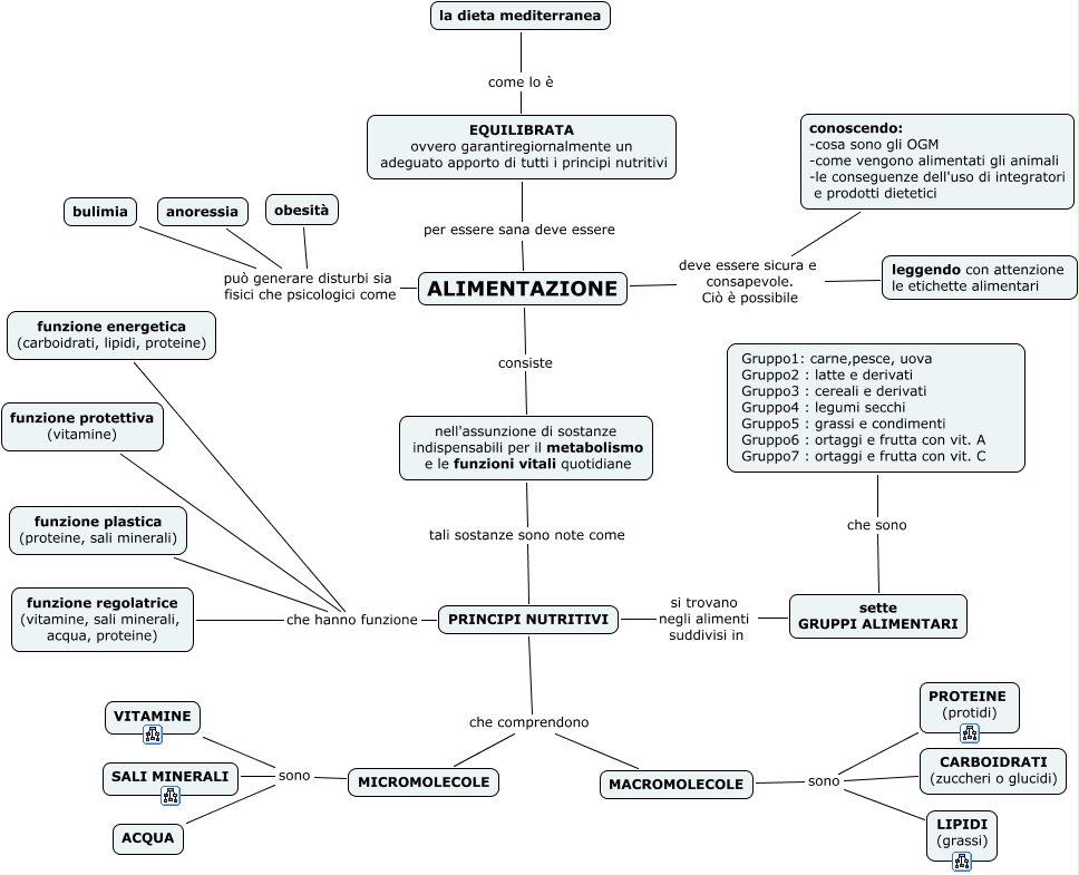 Questa Cmap, creata con IHMC CmapTools, contiene informazioni relative a: alimentazione indire, ALIMENTAZIONE deve essere sicura e consapevole. Ciò è possibile leggendo con attenzione le etichette alimentari, ALIMENTAZIONE può generare disturbi sia fisici che psicologici come bulimia, PRINCIPI NUTRITIVI che hanno funzione funzione protettiva (vitamine), ALIMENTAZIONE consiste nell'assunzione di sostanze indispensabili per il metabolismo e le funzioni vitali quotidiane, ALIMENTAZIONE deve essere sicura e consapevole. Ciò è possibile conoscendo: -cosa sono gli OGM -come vengono alimentati gli animali -le conseguenze dell'uso di integratori e prodotti dietetici, PRINCIPI NUTRITIVI si trovano negli alimenti suddivisi in sette GRUPPI ALIMENTARI, MACROMOLECOLE sono CARBOIDRATI (zuccheri o glucidi), nell'assunzione di sostanze indispensabili per il metabolismo e le funzioni vitali quotidiane tali sostanze sono note come PRINCIPI NUTRITIVI, MICROMOLECOLE sono VITAMINE, MICROMOLECOLE sono SALI MINERALI, ALIMENTAZIONE per essere sana deve essere EQUILIBRATA ovvero garantiregiornalmente un adeguato apporto di tutti i principi nutritivi, MICROMOLECOLE sono ACQUA, PRINCIPI NUTRITIVI che hanno funzione funzione plastica (proteine, sali minerali), ALIMENTAZIONE può generare disturbi sia fisici che psicologici come obesità, MACROMOLECOLE sono LIPIDI (grassi), PRINCIPI NUTRITIVI che hanno funzione funzione energetica (carboidrati, lipidi, proteine), MACROMOLECOLE sono PROTEINE (protidi), EQUILIBRATA ovvero garantiregiornalmente un adeguato apporto di tutti i principi nutritivi come lo è la dieta mediterranea, ALIMENTAZIONE può generare disturbi sia fisici che psicologici come anoressia, PRINCIPI NUTRITIVI che comprendono MICROMOLECOLE